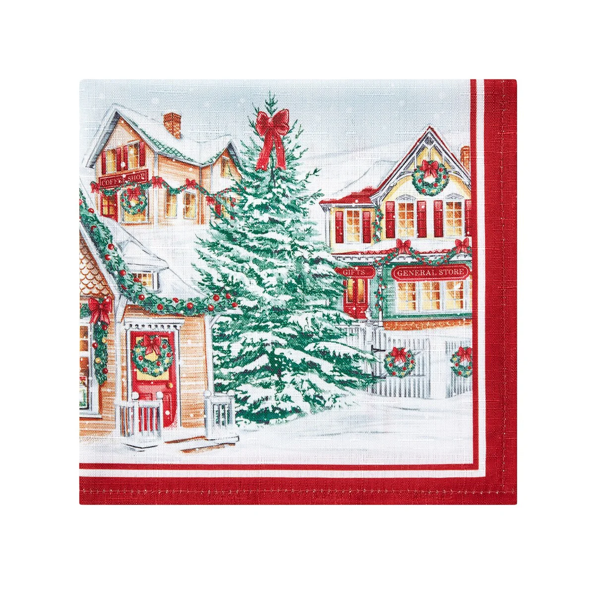 The Storybook Christmas printed napkins bring a charming, nostalgic look to your table setting throughout the Christmas and holiday season. Inspired by beloved Christmas stories, this napkin set is decorated with a quaint, snow-covered holiday village, green pine trees, and festive garland with red bows and ornaments. On soft white ground, it also features a classic red double bordered design. Excellent for special occasions, events, parties, family gatherings and everyday use during the winter months and holiday season. Soft and durable fabric can be ironed to release stubborn creases and keep your napkins wrinkle free. Hemmed edge adds a finished look and prevents wear and tear. Napkins measure 17x17 and are sold as a set of 4. 100% Polyester. Easy care, machine washable. Coordinate to Storybook Christmas tablecloth, placemats, table runner and tree skirt to complete the look.