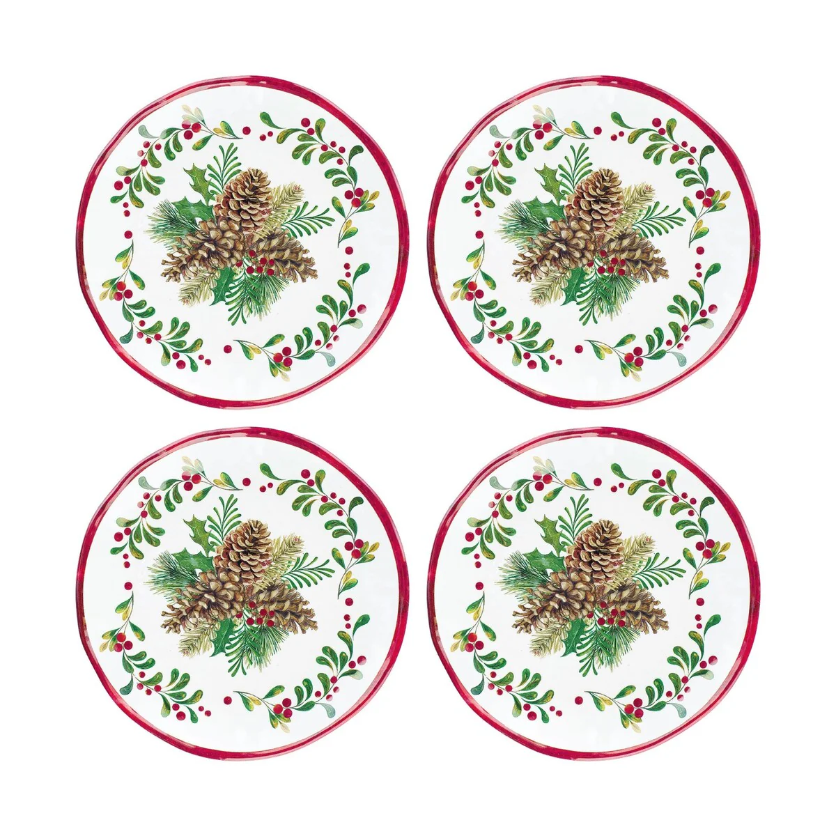 Bring the beauty of the outdoors to your dining table with this 16-piece Pinecones Melamine Dinnerware Set. Ideal for indoor and outdoor dining, this set features a charming pinecone print that will add a touch of joy to your everyday meals or your holiday gatherings. Made of shatterproof and food-safe melamine, this set is perfect for entertaining and easy to clean in the dishwasher. The set includes 4 dinner plates, 4 salad plates, 4 bowls, and 4 side plates, each with the look and feel of ceramic but lighter and more durable.