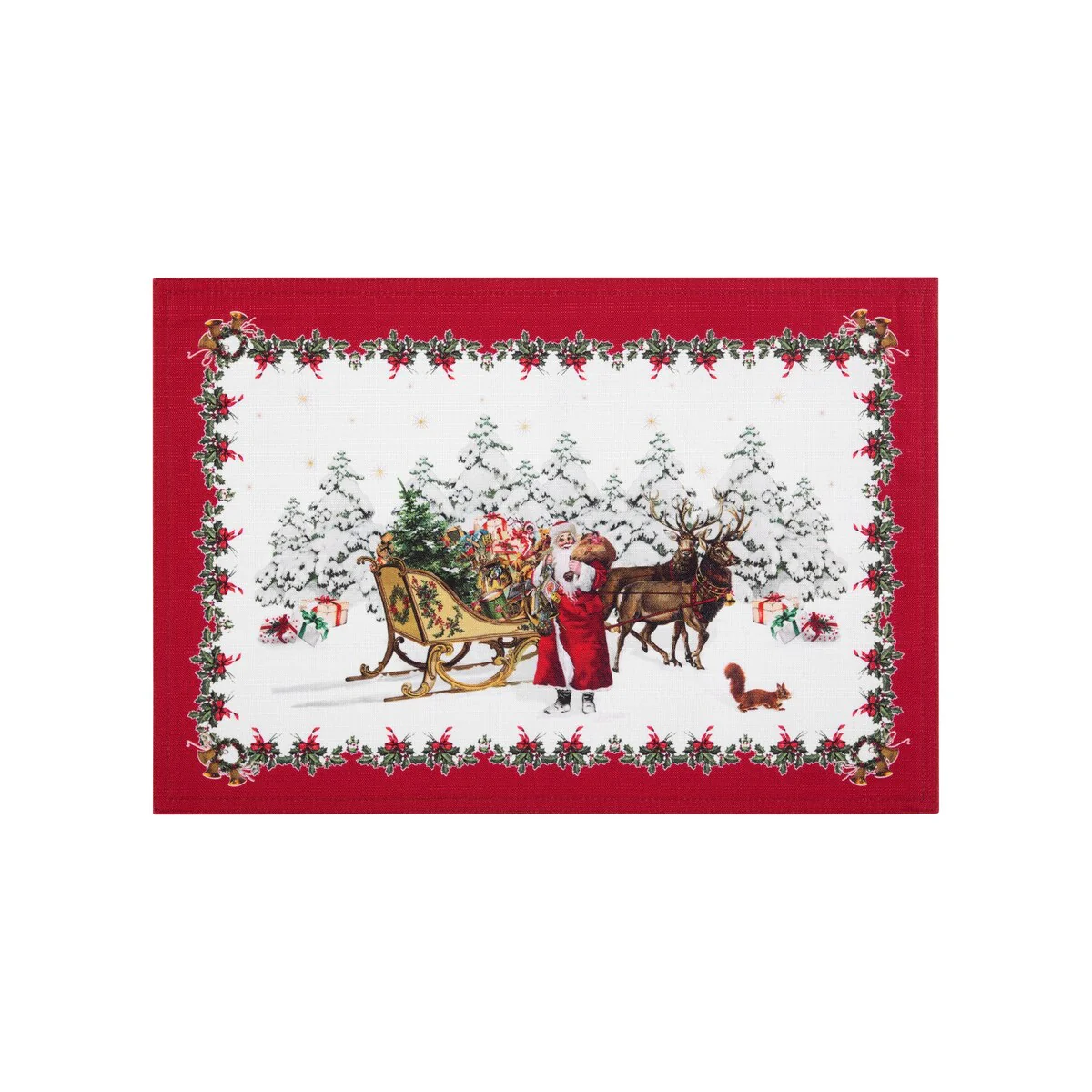- Classic Design: The Villeroy & Boch Toy's Fantasy Placemat Set of Four features a snowy pine forest scene with Santa Claus, along with a sleigh full of toys, his magic reindeer, ringing bells, and golden stars over a soft white ground accented with a red border and green holly leaves and berries making it the perfect, timeless addition to your holiday decor.