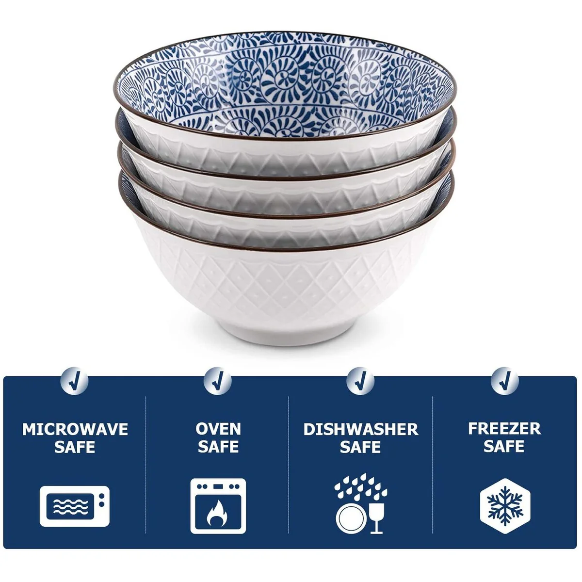 - Ideal Present: the cereal bowls are bright and cheerful, with unique blue-white patterns both inside and outside of the bowls. They are the art and made the food look professional and delicious. Also the right present choice for Thanksgiving, Christmas, housewarmings, and weddings.