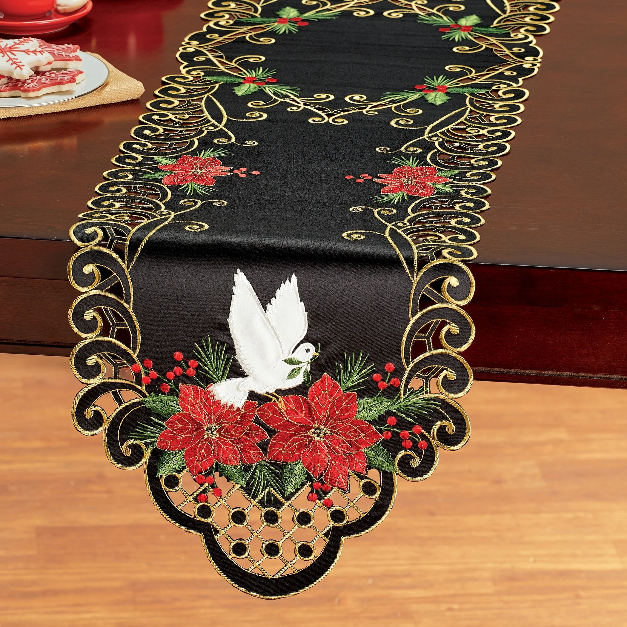 Holiday Poinsettia Dove Cut-Out Table Linens