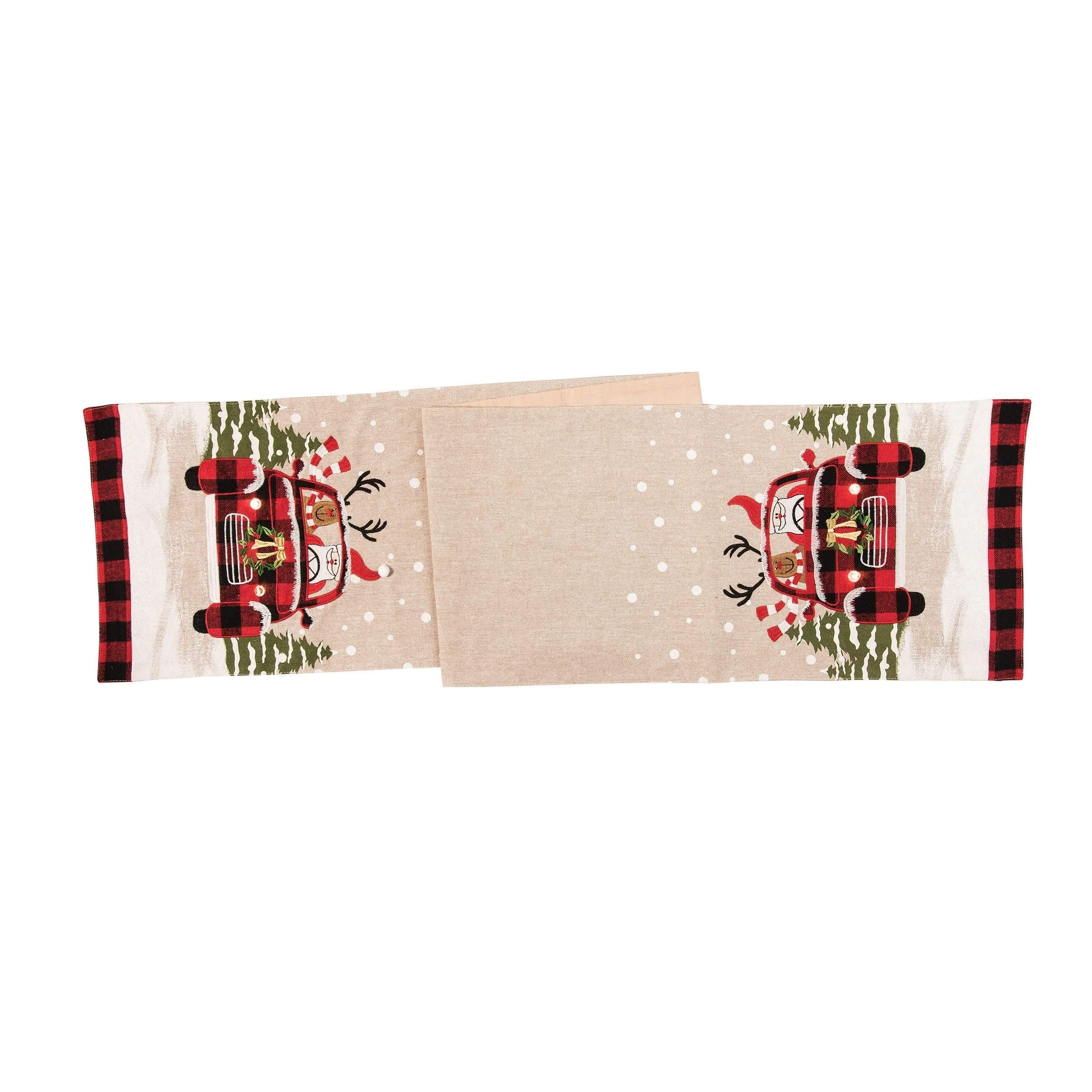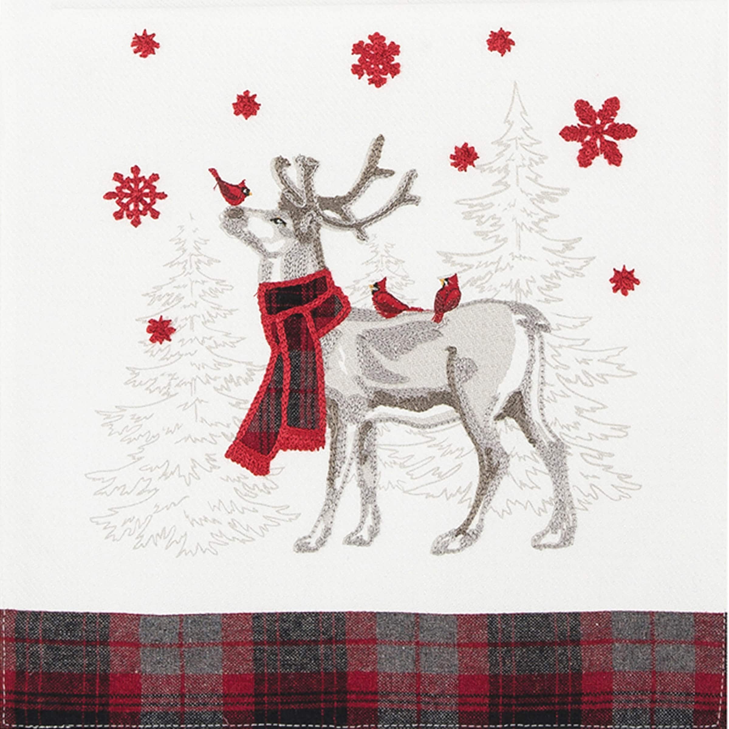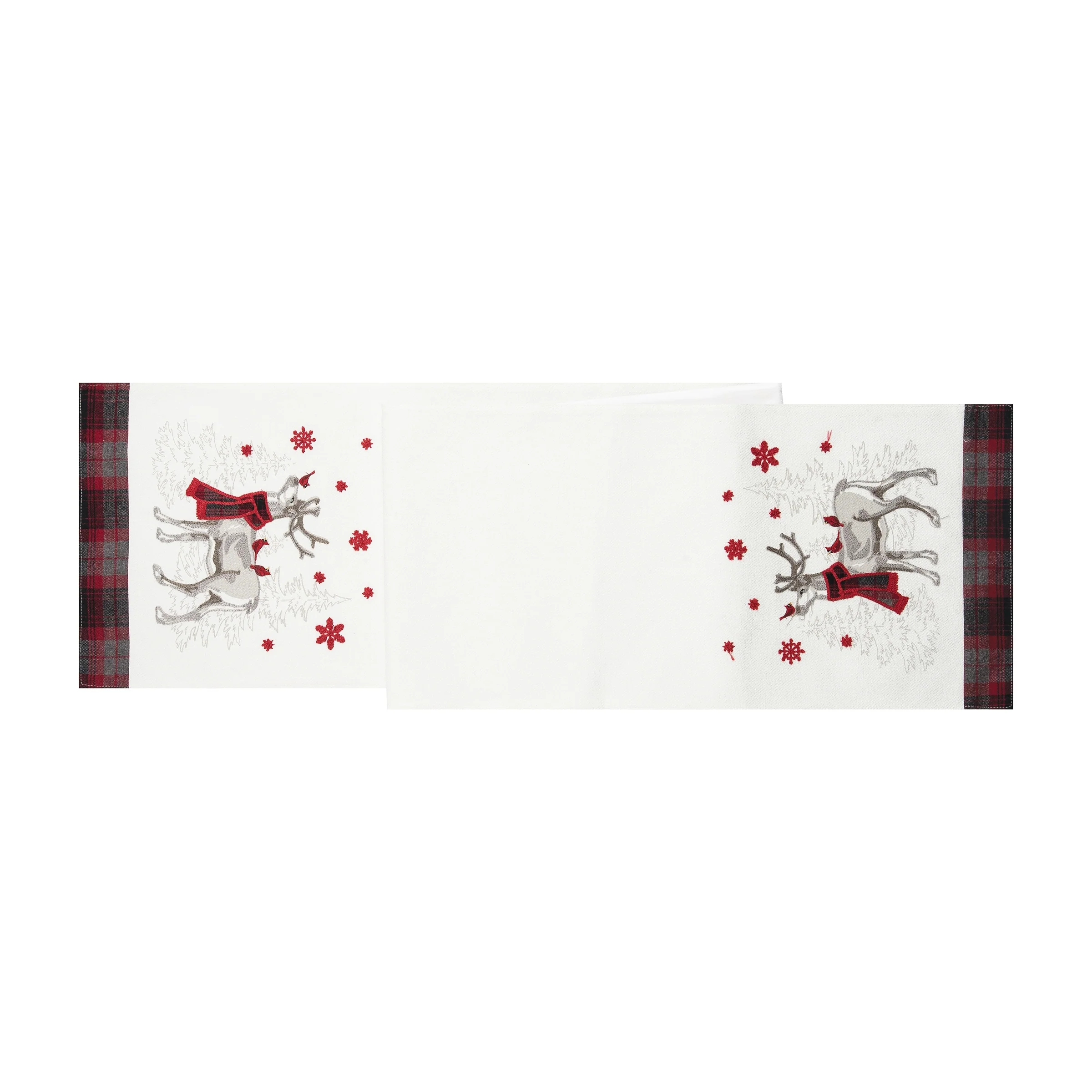 Frosty Deer White Deer in Red and Black Plaid Scarf and Red Snowflakes 13" X 72" Cotton Machine Washable Table Runner
