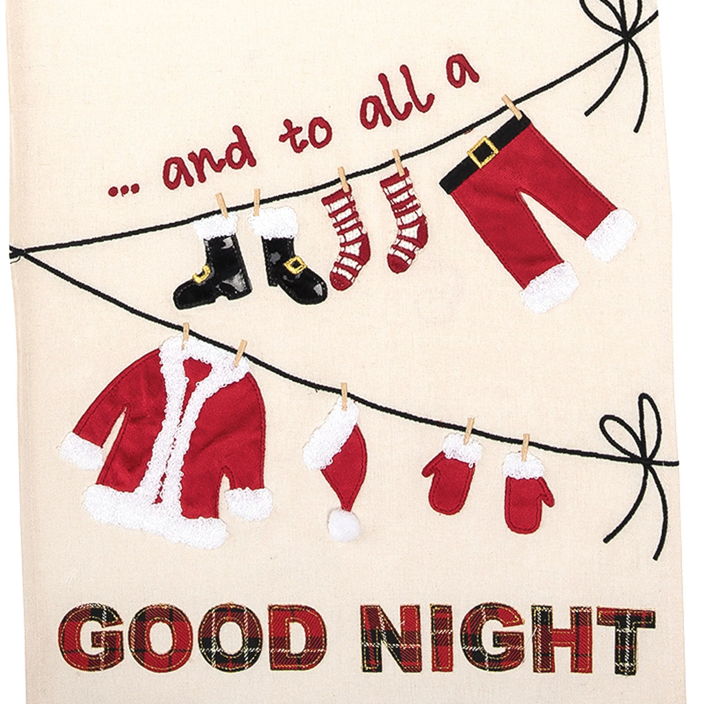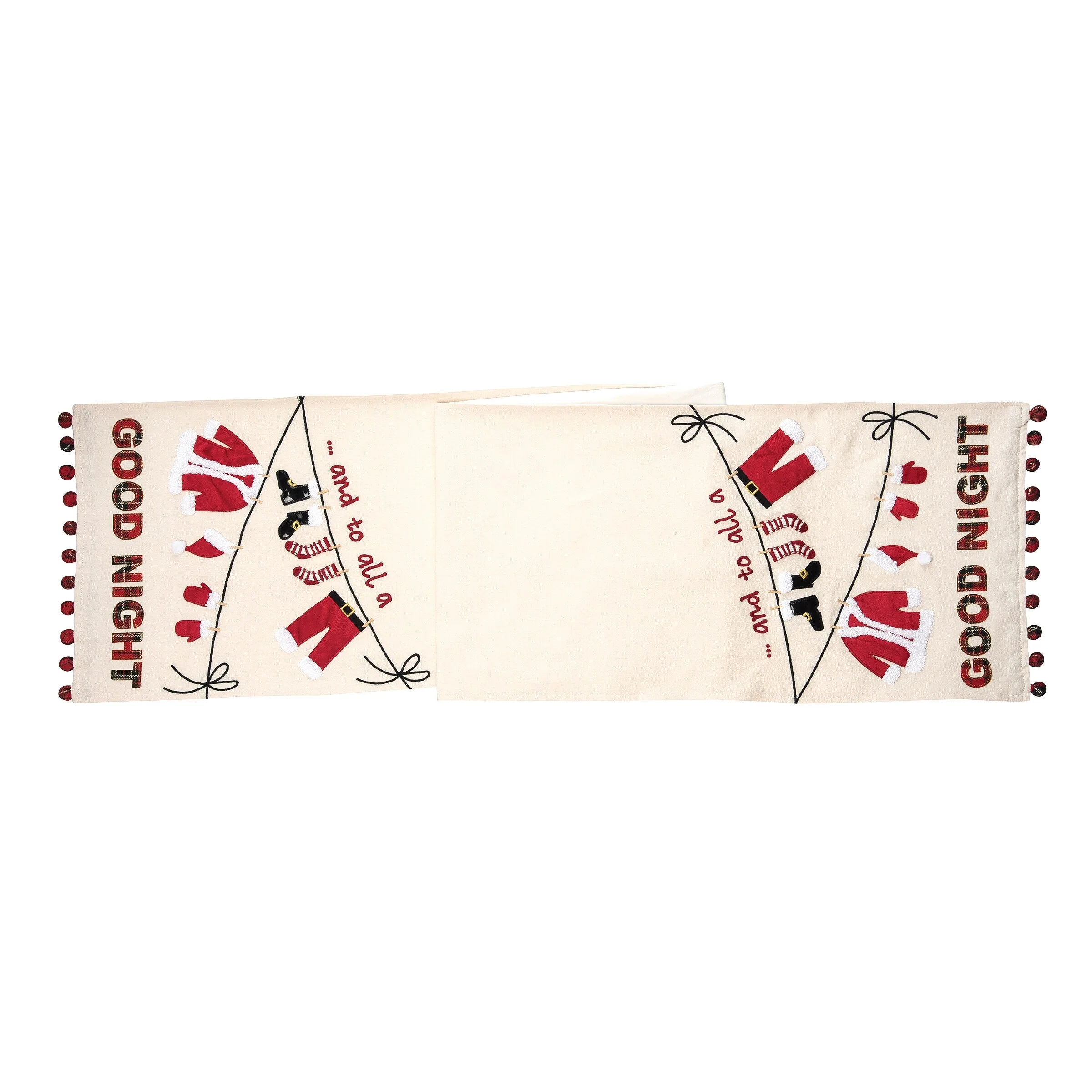 "And to All a Good Night" Sentiment Santa Clothes on Clothesline Red Pom Poms 12" X 72" Cotton Embroidered Table Runner