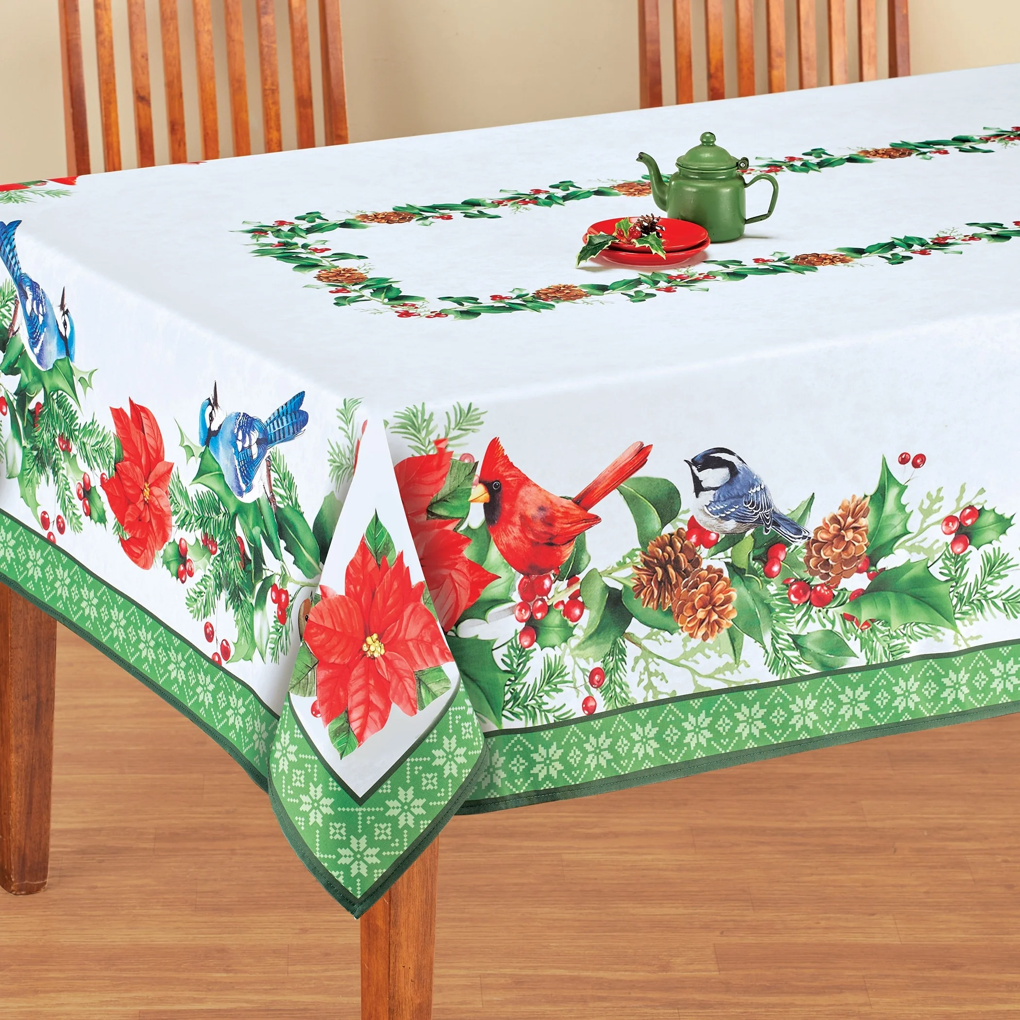 Birds Poinsettia Festive Printed Tablecloth