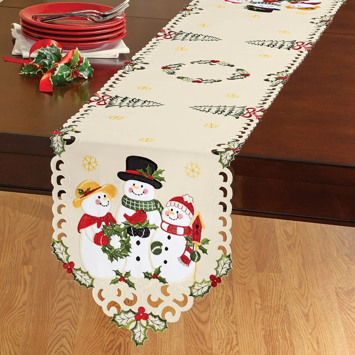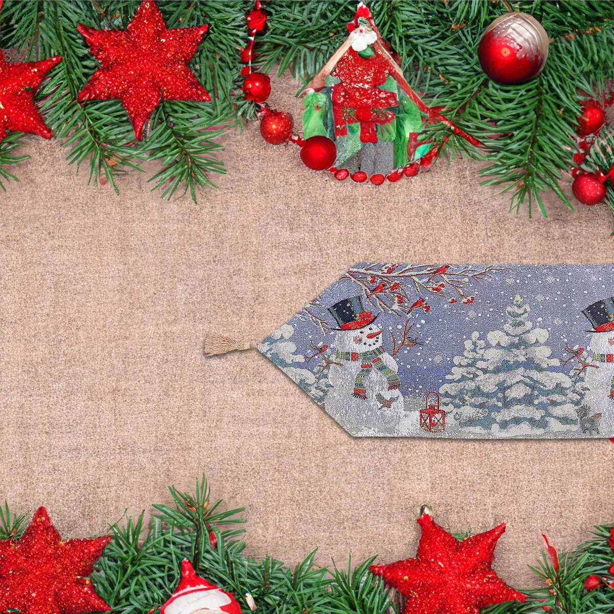 Christmas Tapestry Table Runner Black Top Hat Snowman 54"