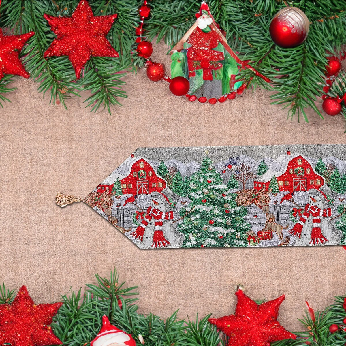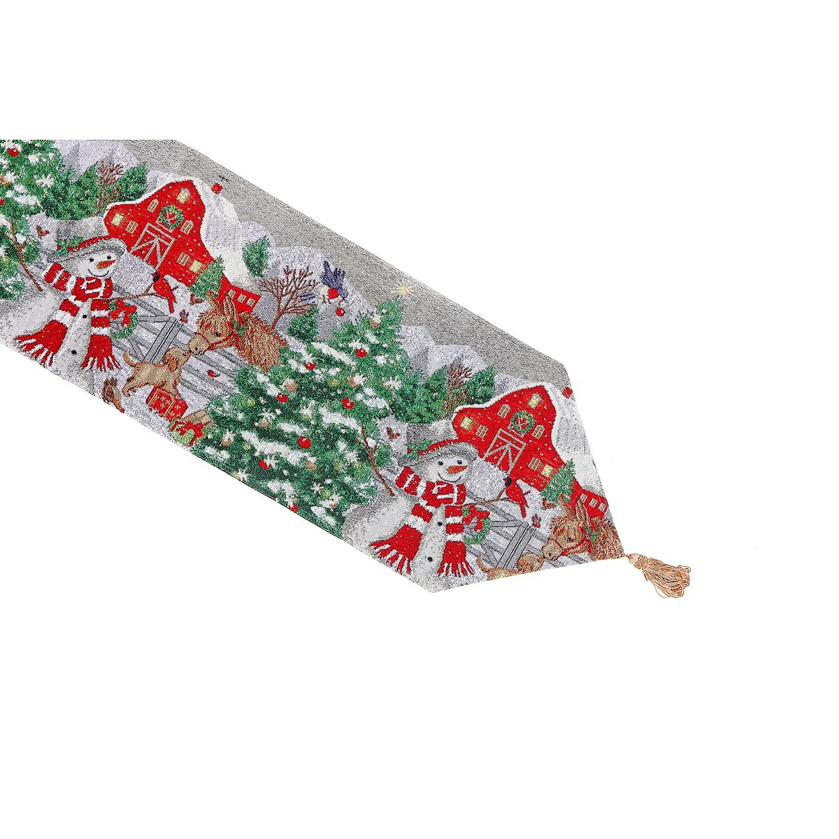Christmas Tapestry Table Runner Snowman With Barn 36"