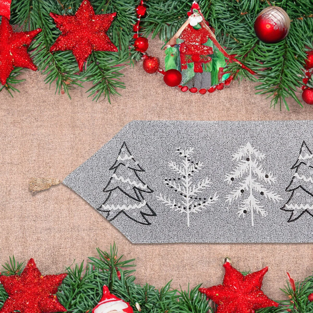Christmas Tapestry Table Runner Gray Trees 36"