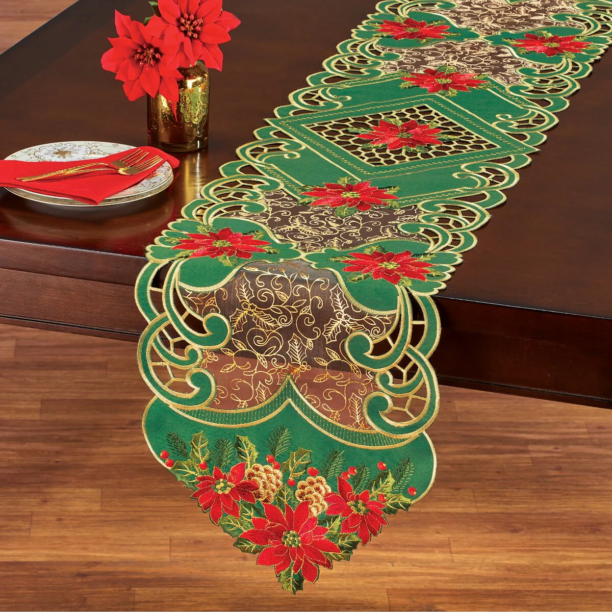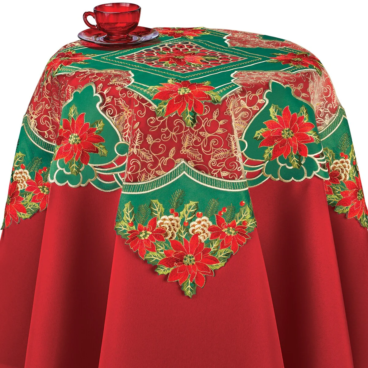 Embroidered Holiday Poinsettia Flowers Table Linens