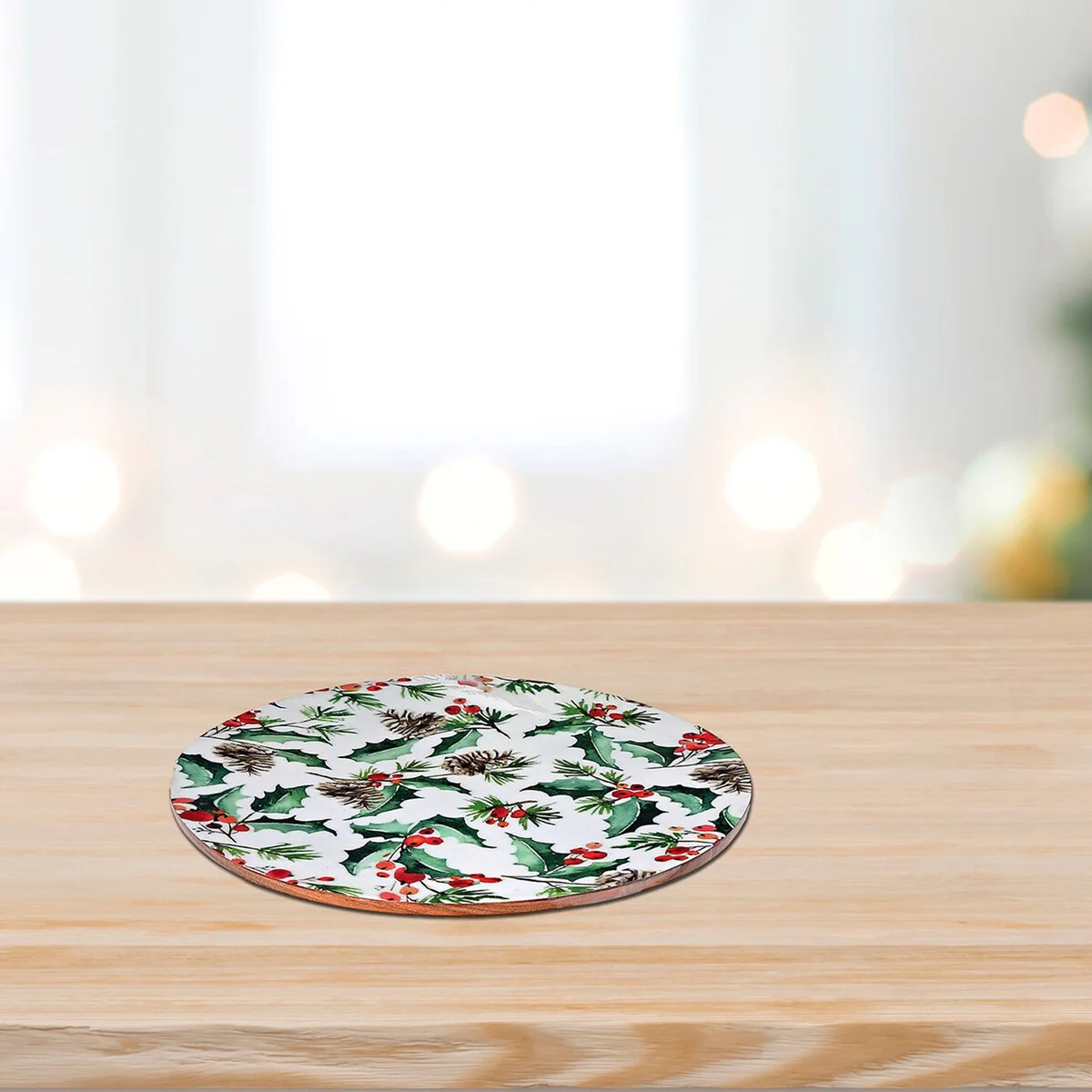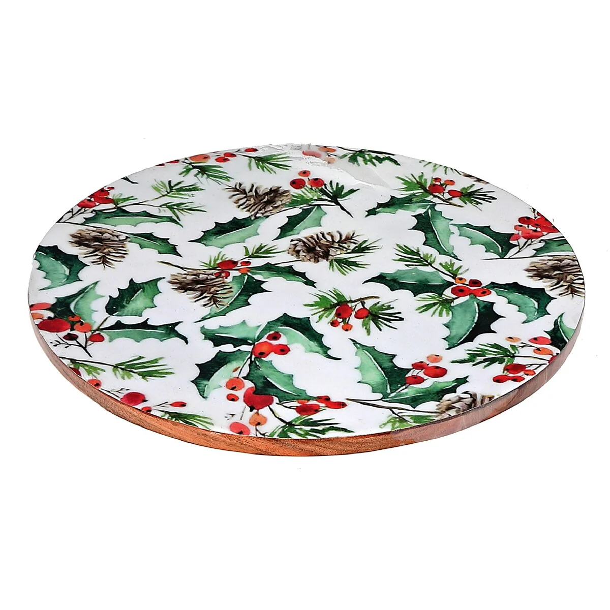 Christmas Enameled Acacia Wood Lazy Susan Holly Berries