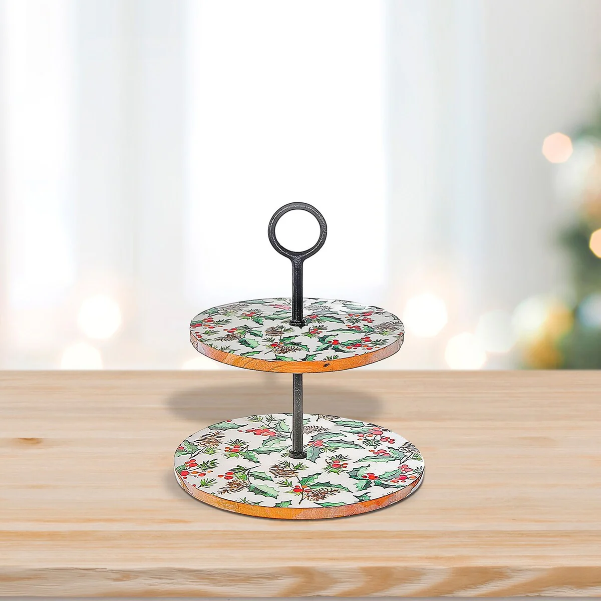 Christmas Enameled Acacia Wood 2 Tier Cake Stand Holly Berries