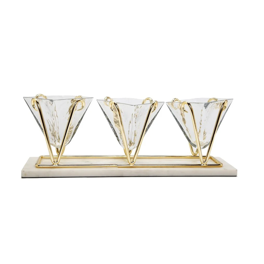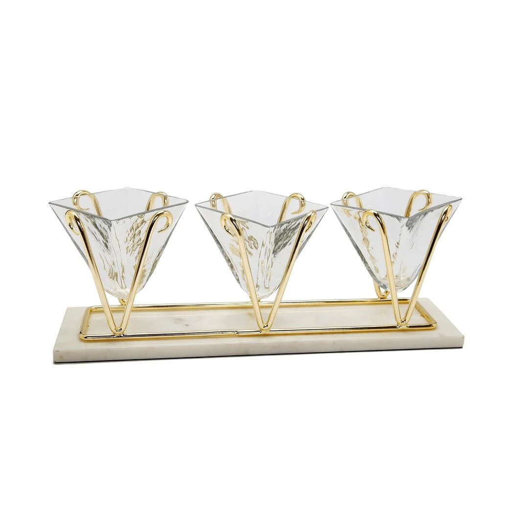 3 Sectional Glass Relish Dish on Marble Base with Gold Brass