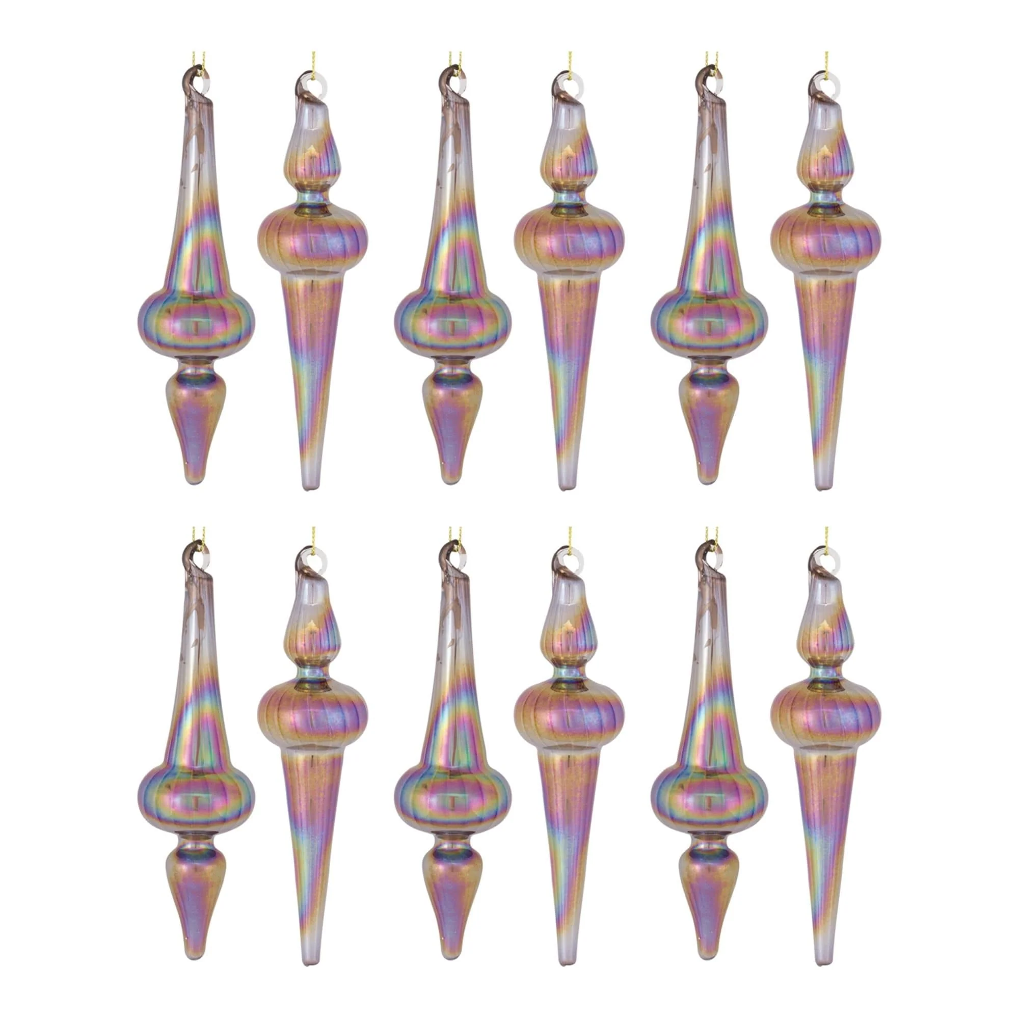 Enhance the elegance of your Christmas tree and holiday decorations with these glass ornaments. These dazzling ornaments feature a striking finial shape in multicolor tones. The iridescent glass finish adds a touch of magical shimmer to your festive display. Whether you're embellishing your own home or seeking a special gift, these ornaments will bring joy and sophistication to your holiday celebrations.
