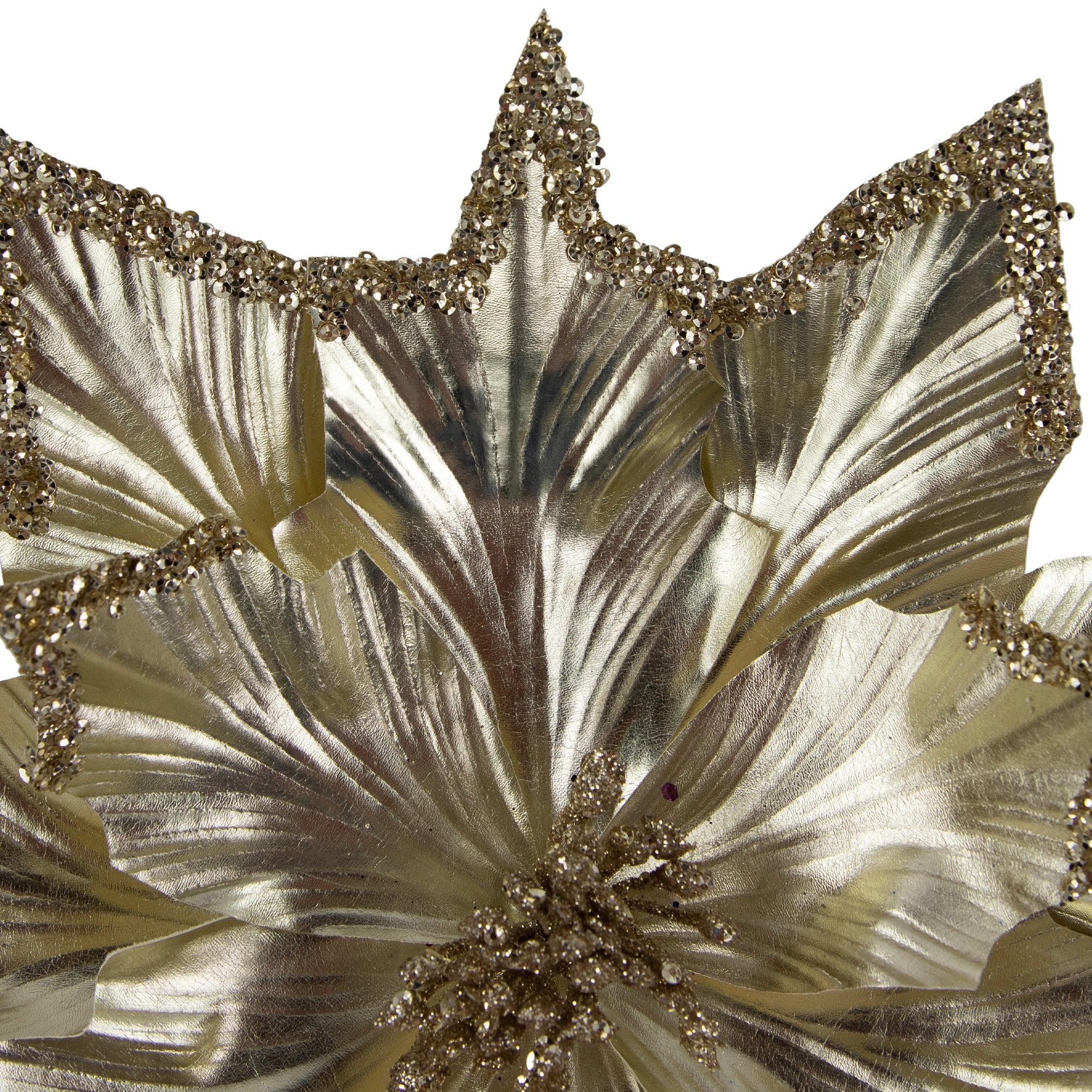 Add a touch of glamour to your holiday décor with this stunning poinsettia Christmas stem. This stunning stem features sequined petal edges, and a gold glitter accents. Whether used as part of a larger arrangement or on its own, this stem is sure to make your home merry and bright.