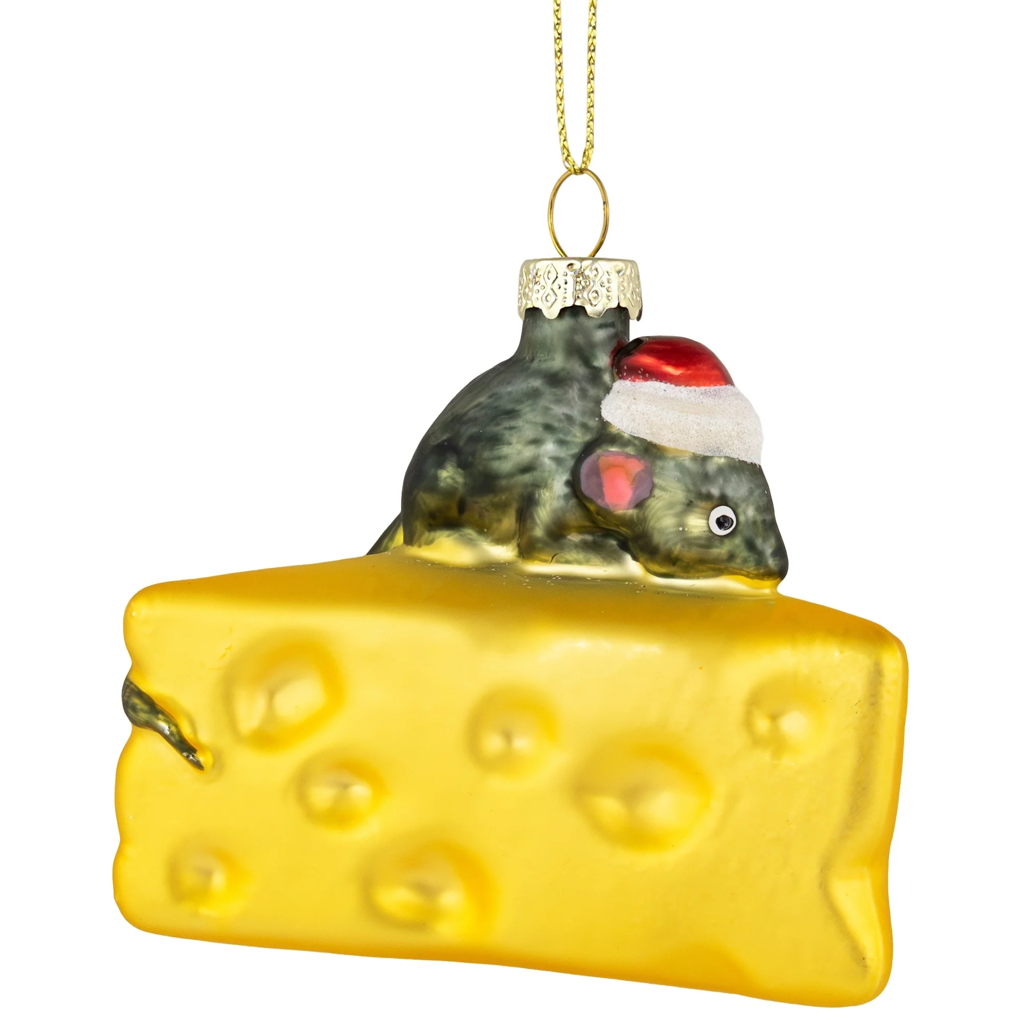 Add a touch of humor to your Christmas tree with this adorable mouse glass ornament. This whimsical ornament features a gray mouse wearing a festive Santa hat perched atop a yellow cheese wedge. This ornament captures the joy and playfulness of the holiday season. Hang it on your tree and let this cute little mouse bring a sprinkle of cheese-loving cheer to your Christmas decorations. Perfect for animal lovers and cheese enthusiasts, this ornament is sure to become a favorite addition to your festive decor.