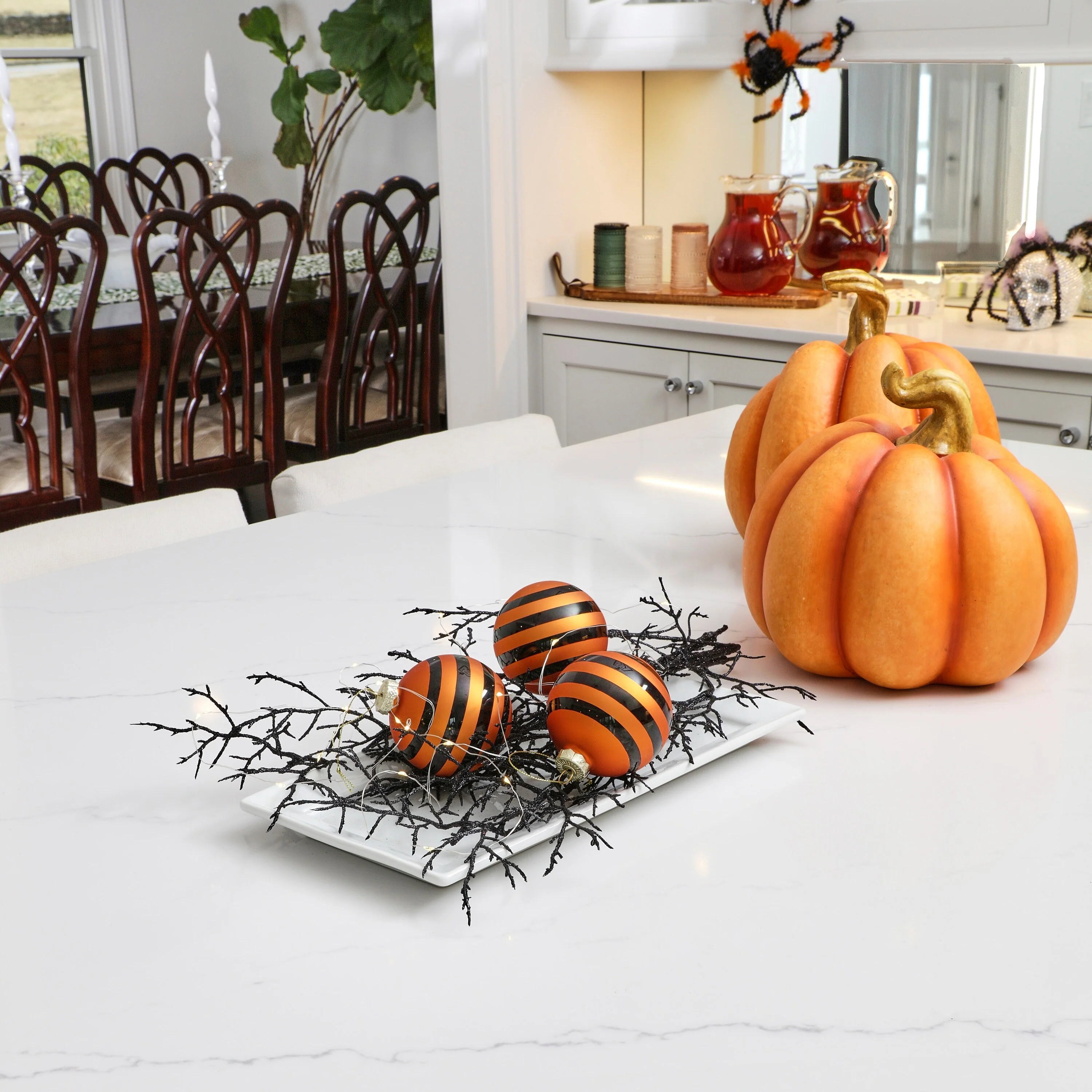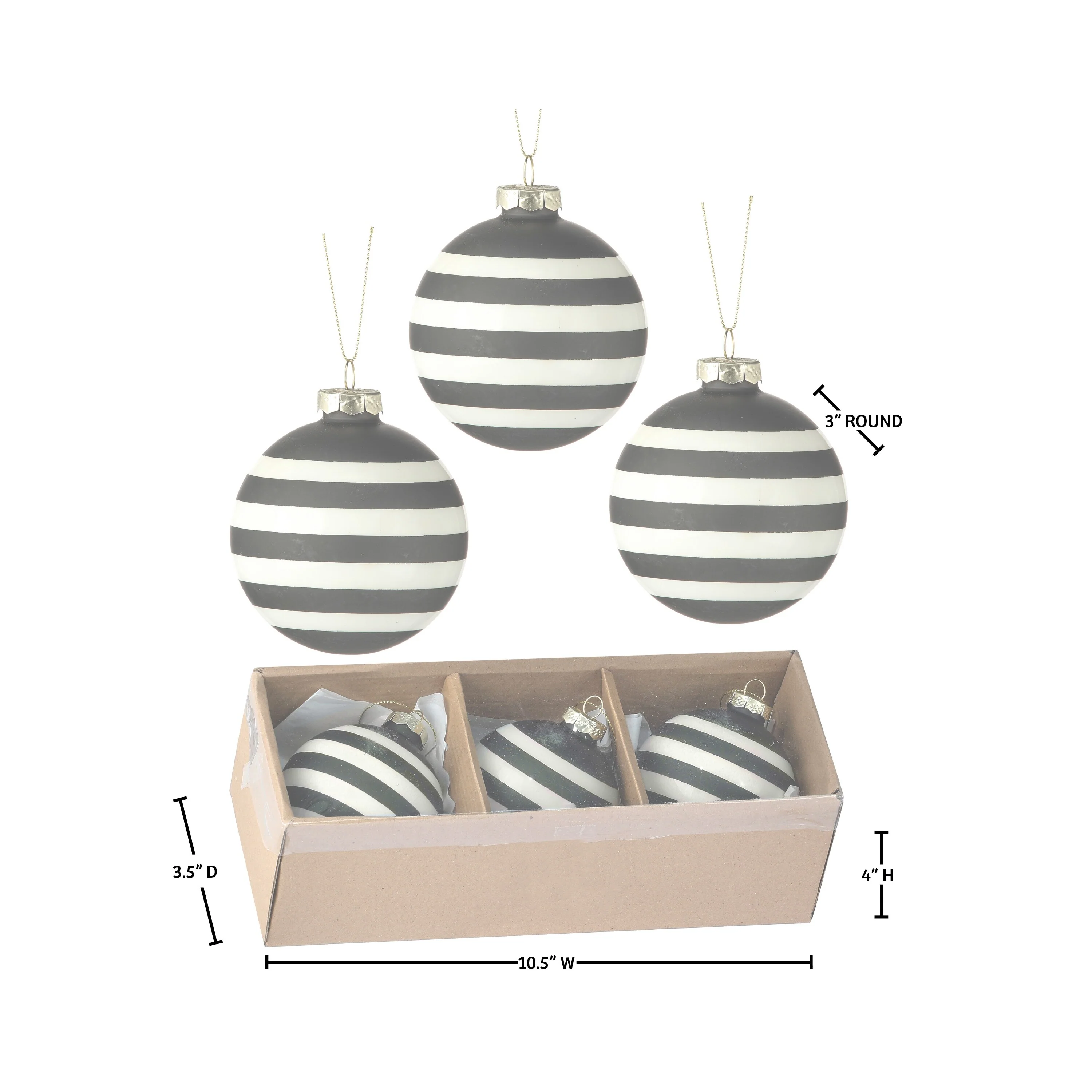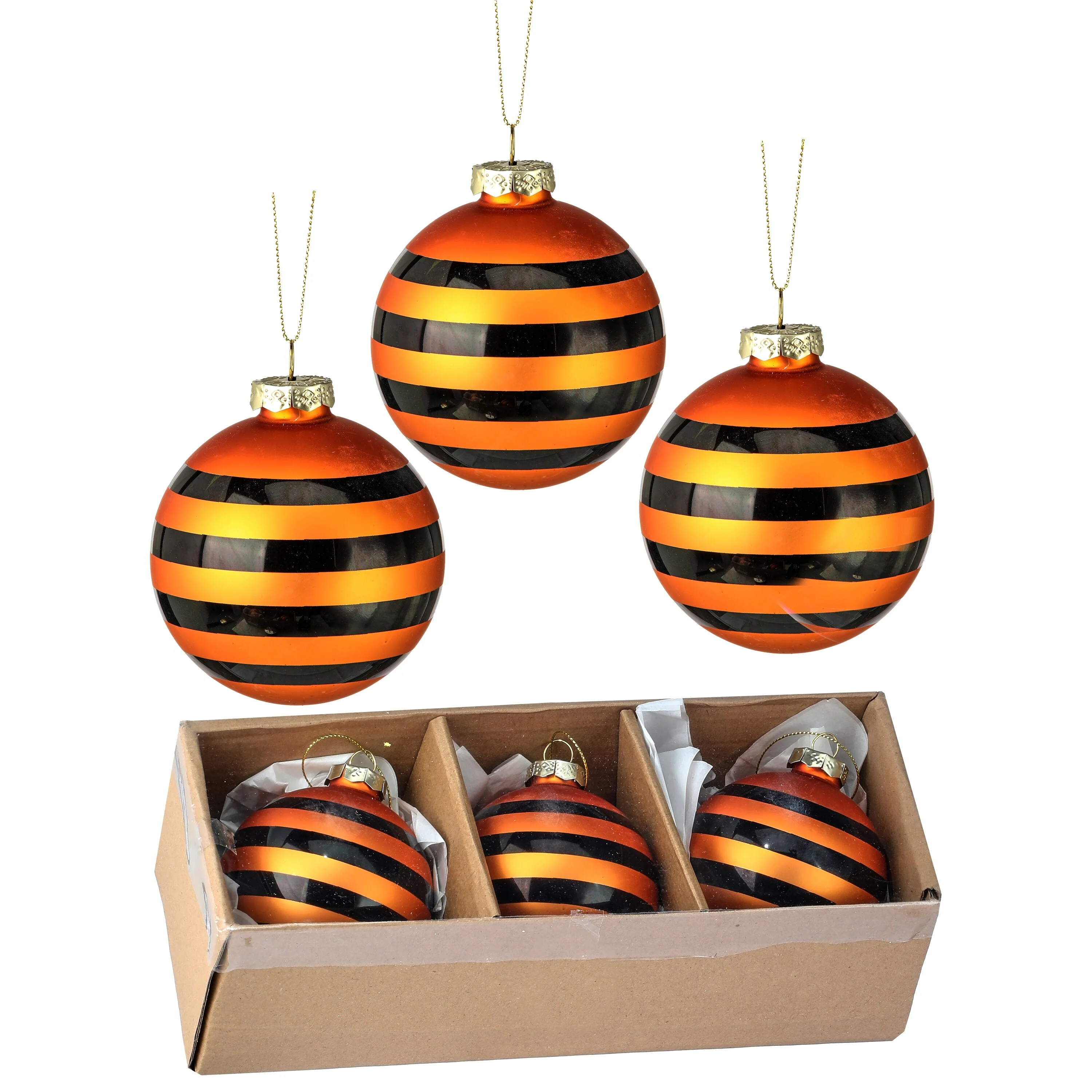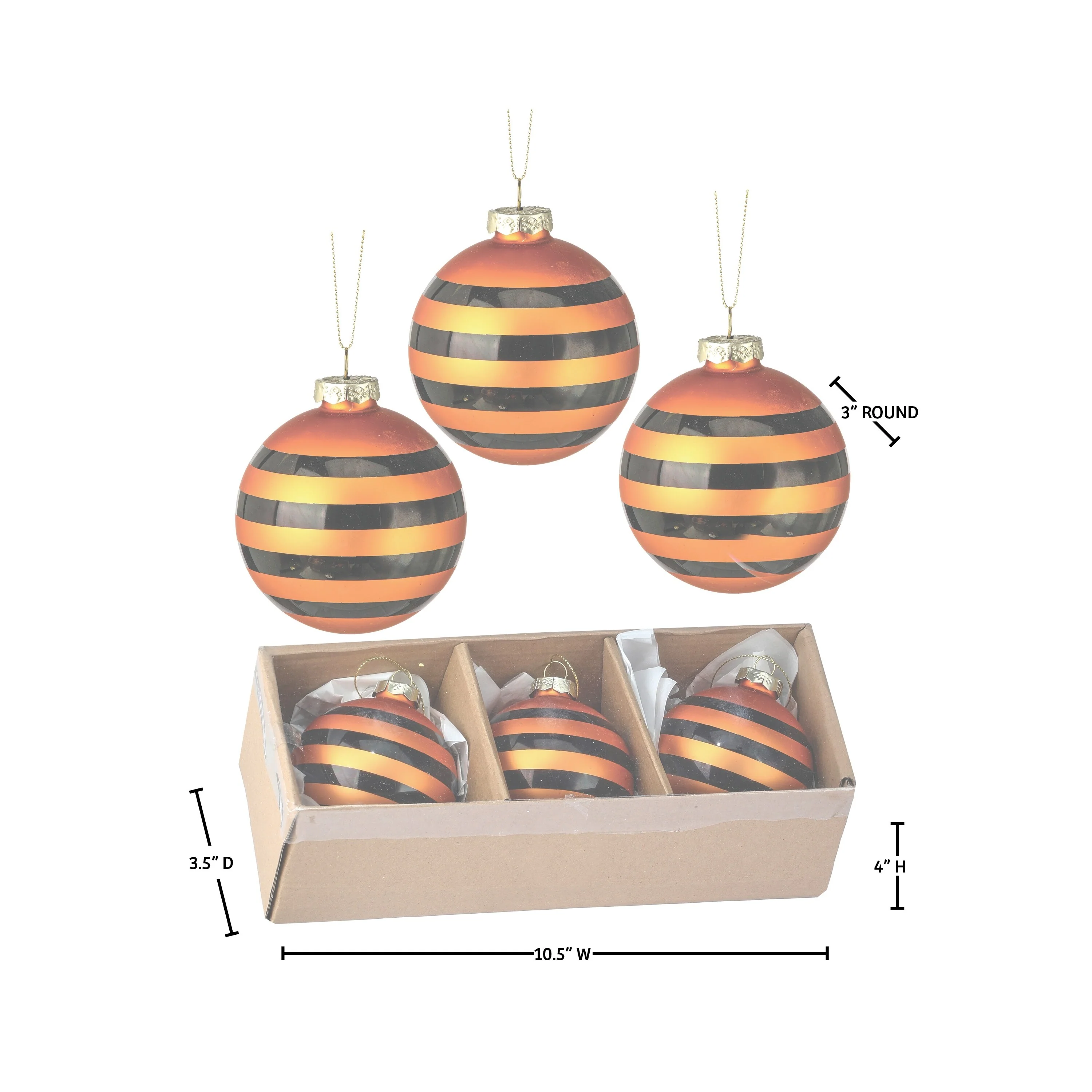 Celebrate the spooky season with this set of 3" Glass Stripe Halloween Ball Ornaments, packed in a box of 3. Featuring bold, festive stripes in vibrant Halloween colors, these ornaments add a playful yet eerie touch to your holiday décor. Perfect for hanging on your Halloween tree, wreaths, or as part of your spooky displays, these glass ornaments will bring a fun and spooky vibe to your celebrations. Create a bewitching atmosphere with this unique and eye-catching set!