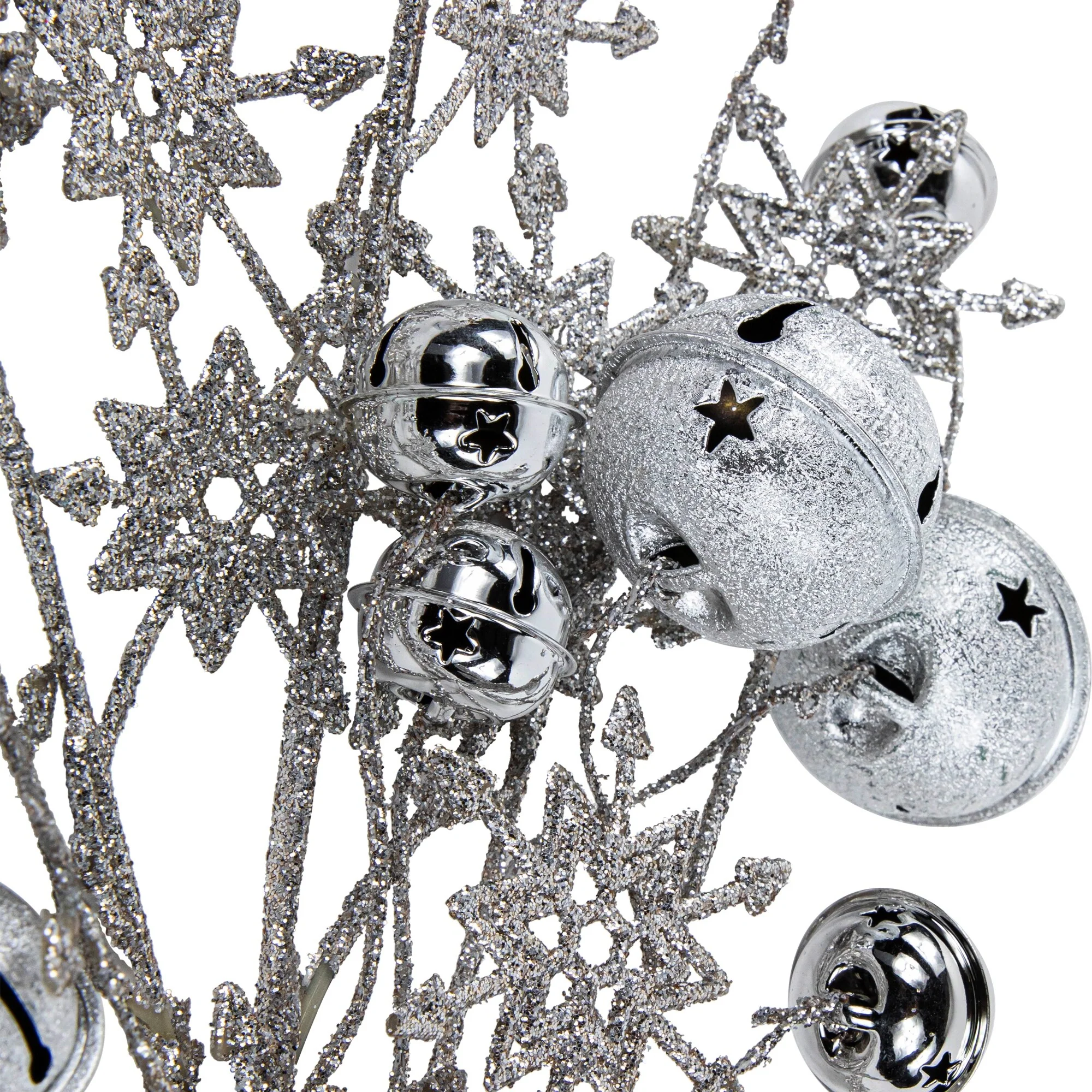 This Christmas spray will add all the needed sparkle for this holiday season. The silver, glitter drenched snowflakes and shiny jingle bells that ring with cheer, is perfect for Christmas trees. It can also be added to vases, adding flair to a beautiful dinner table arrangement, decorative floral display and winter craft projects. Adding a few of these to your winter decor may be all you need to complete your holiday decorating.