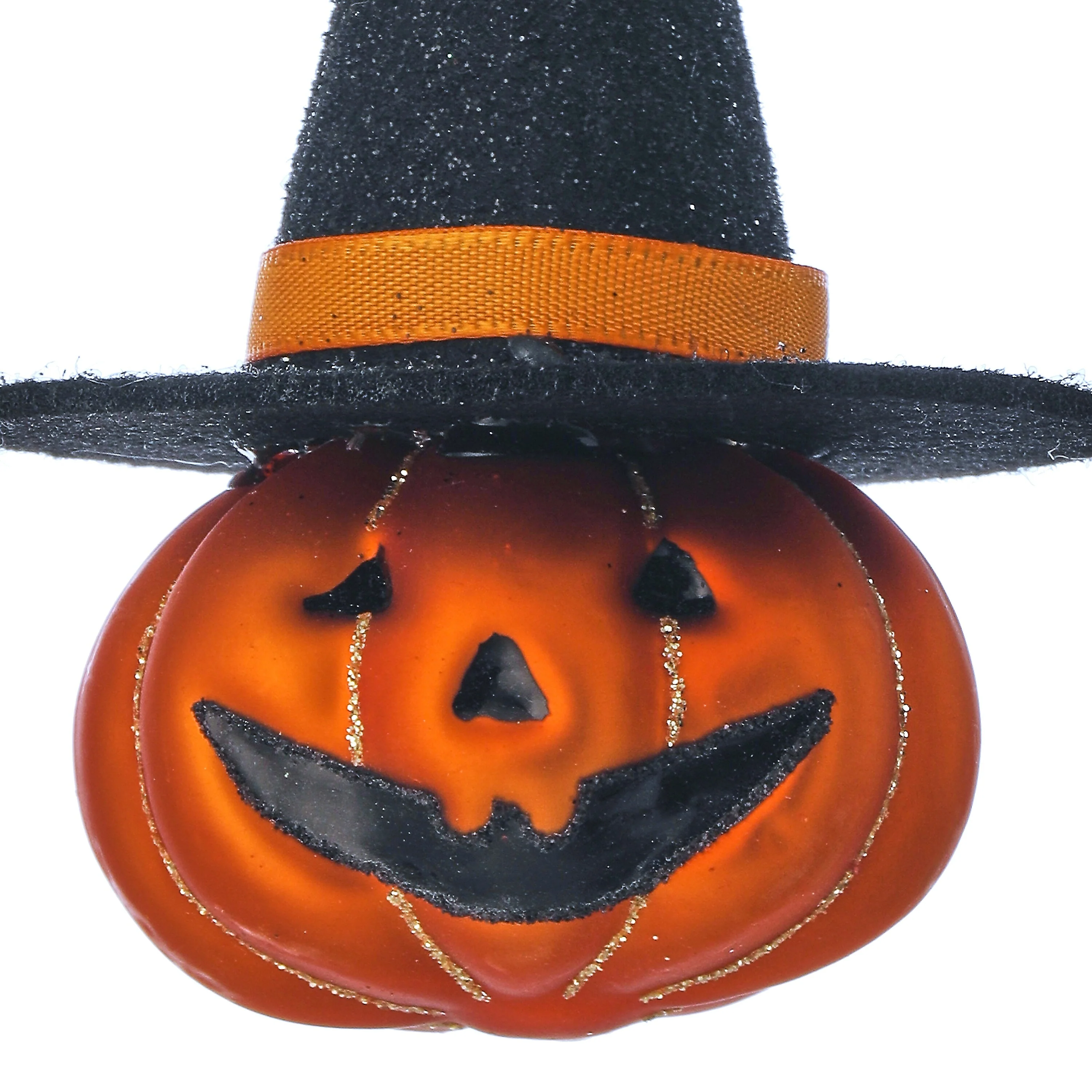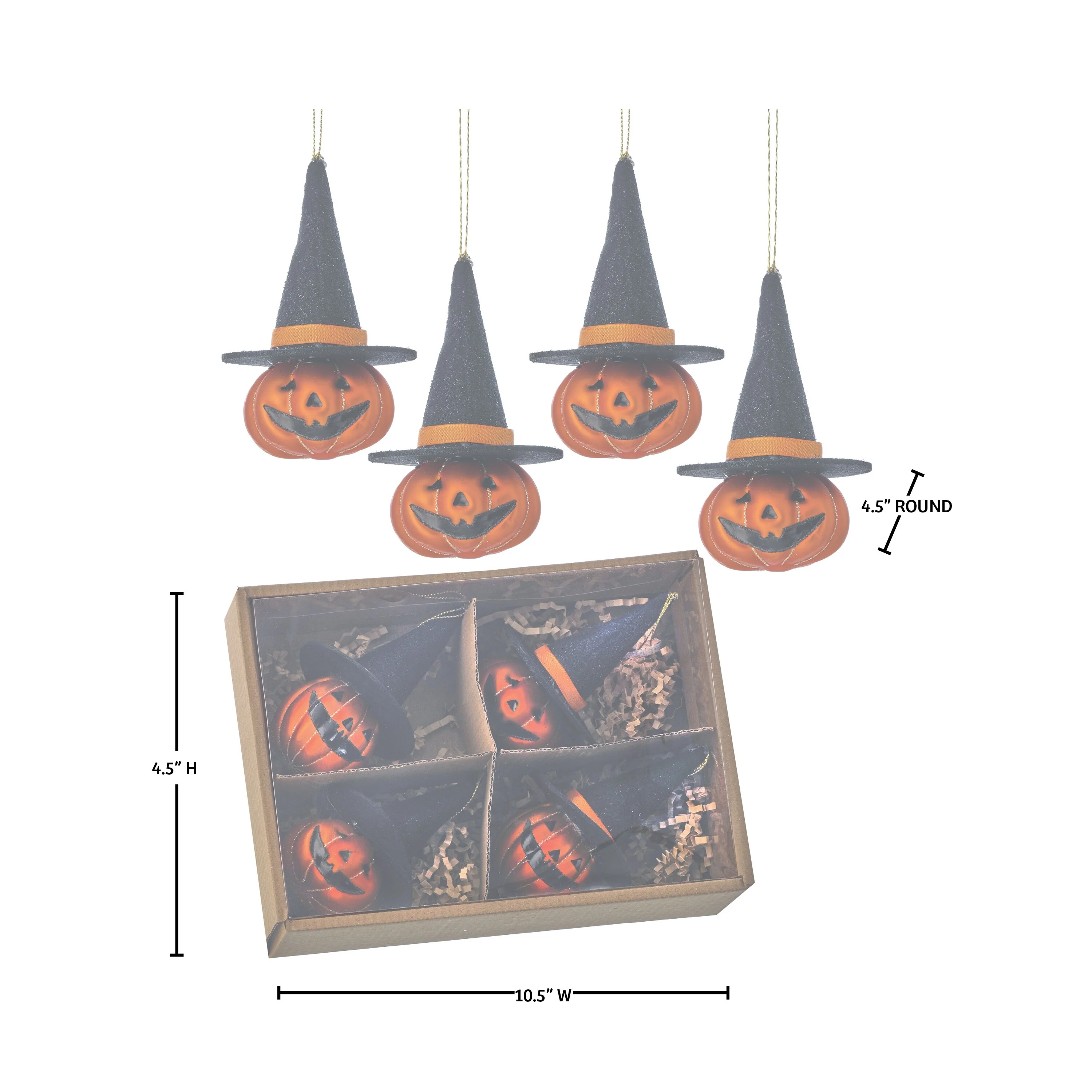 Enhance your Halloween décor with these 4.5" Glass Jack-O'-Lantern Ornaments, packed in a set of 4. Each ornament features a classic, hand-painted pumpkin design with intricate detailing, adding a touch of festive charm to your tree or décor. Crafted from high-quality glass, these ornaments are perfect for creating a spooky yet sophisticated atmosphere. Adorable felt hats and touches of glitter make them stand out. A gold string allows you to easily hang on your Halloween tree or display it as part of your seasonal decorations. These Jack-O'-Lanterns will bring a glow of holiday spirit to your home!