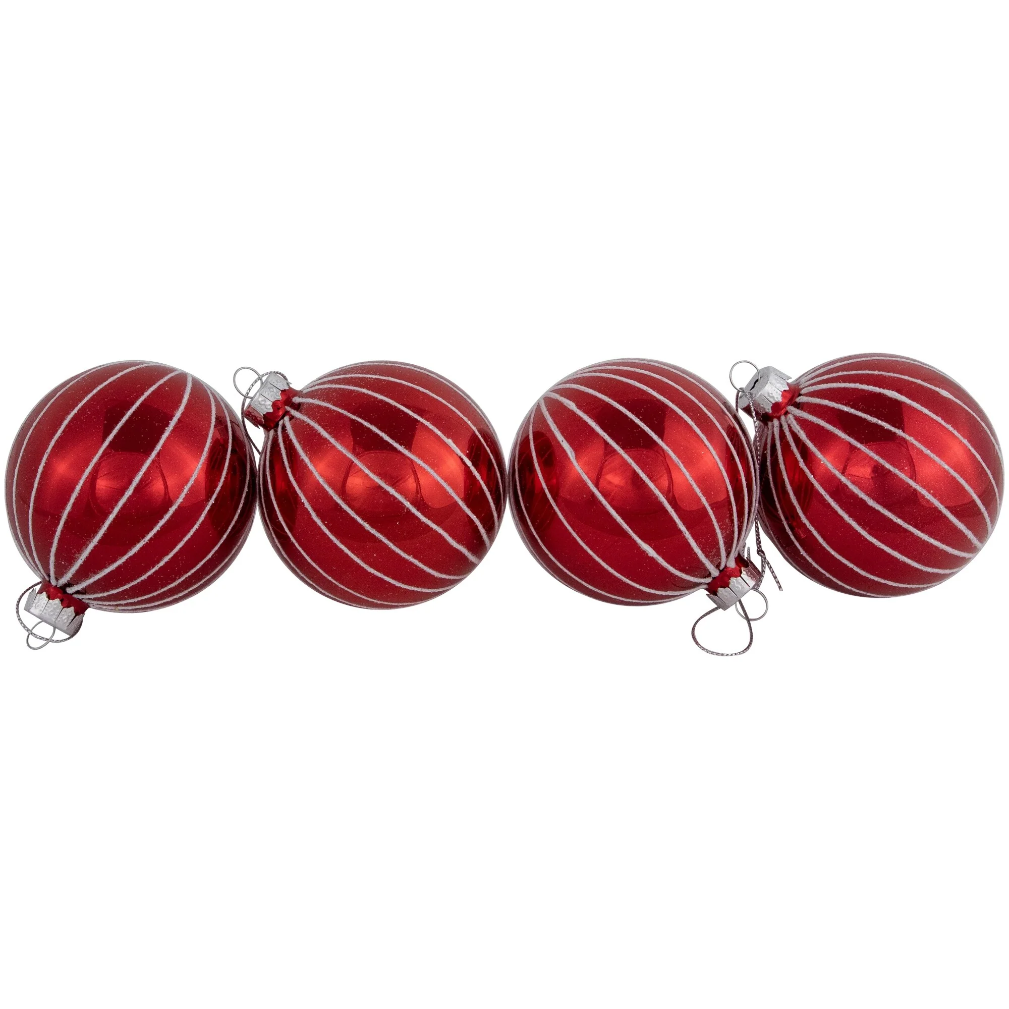 These exquisite ornaments feature a delightful shiny red finish with a white frosted, glitter-striped pattern, reminiscent of candy canes and traditional holiday motifs. These ornaments are visually appealing, providing a pop of color and sparkle to your Christmas tree. With its timeless design, these ornaments are perfect for adding a festive and cheerful atmosphere to your home during the holiday season. Pair with our striped glass finial Christmas Ornament for a complete look.