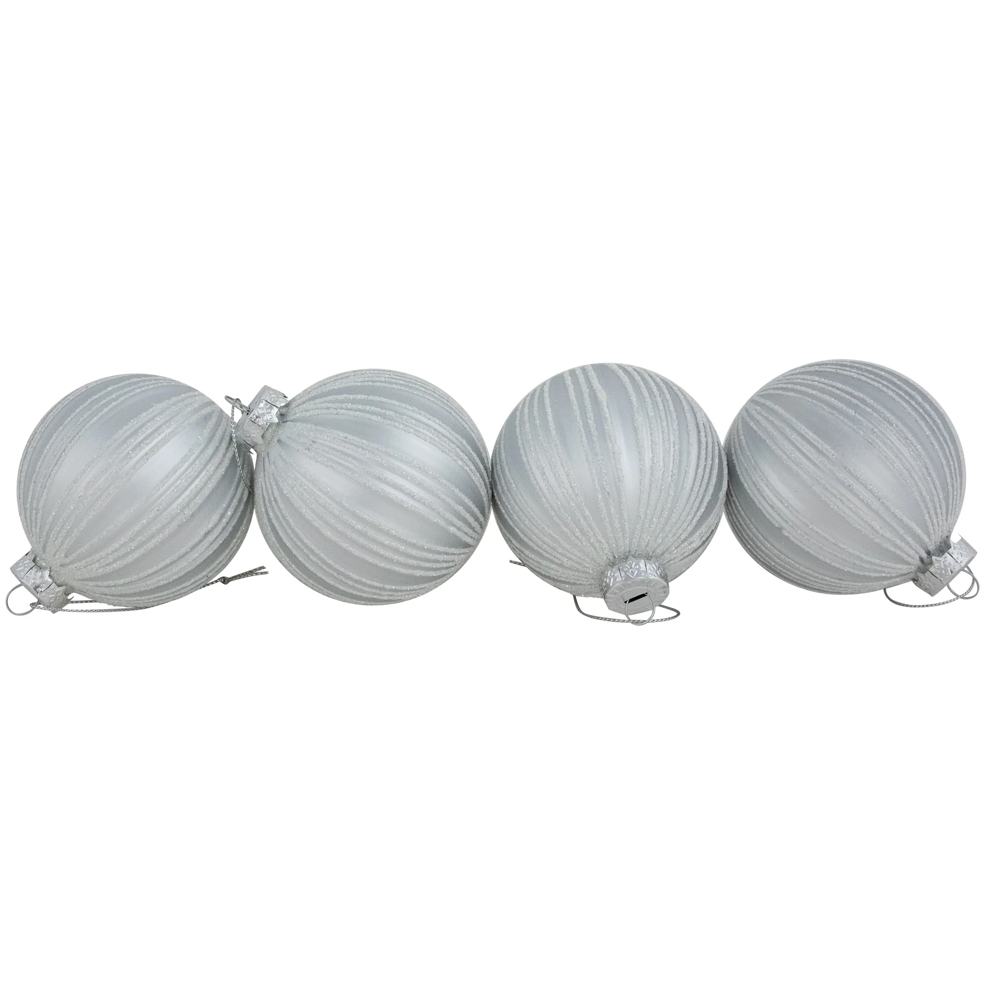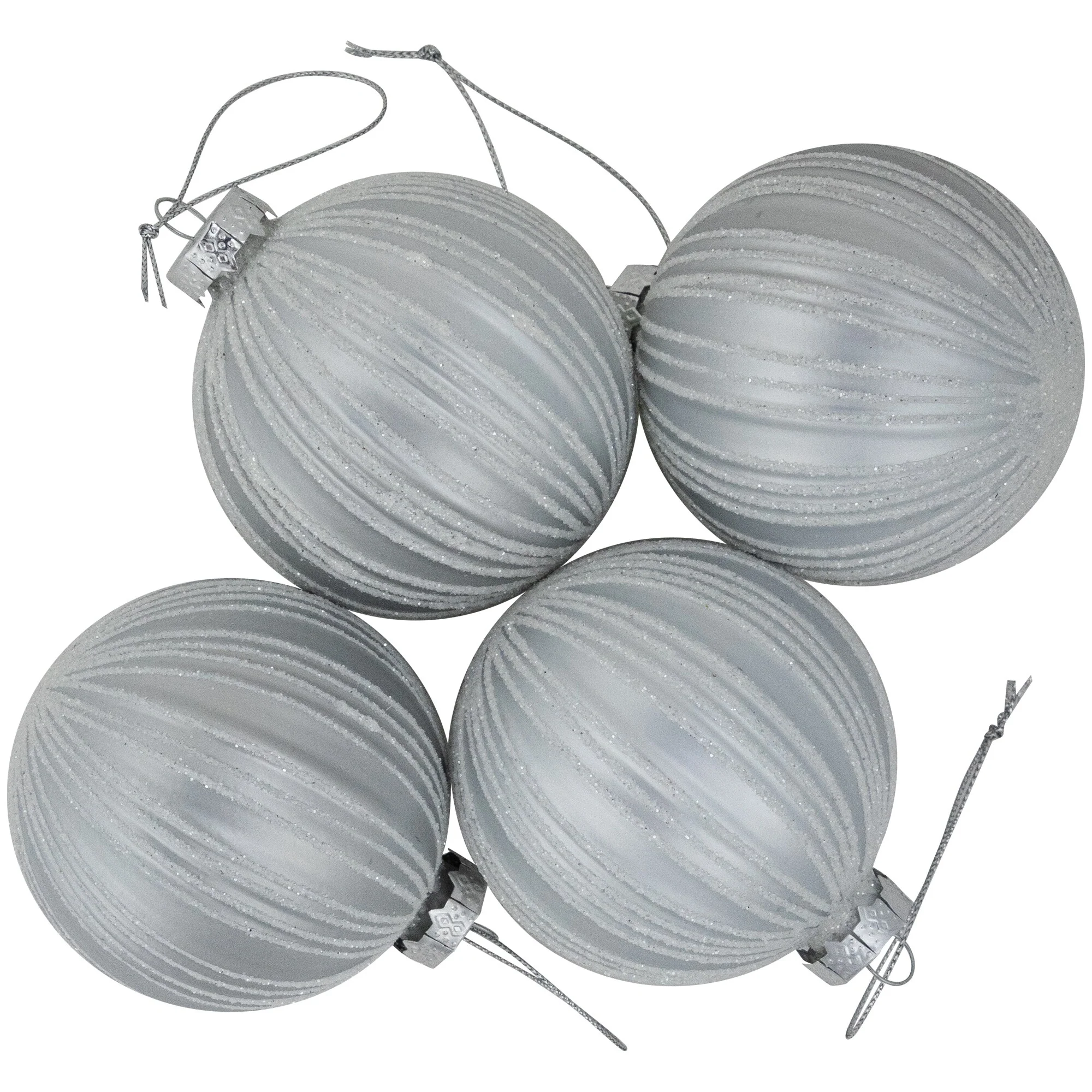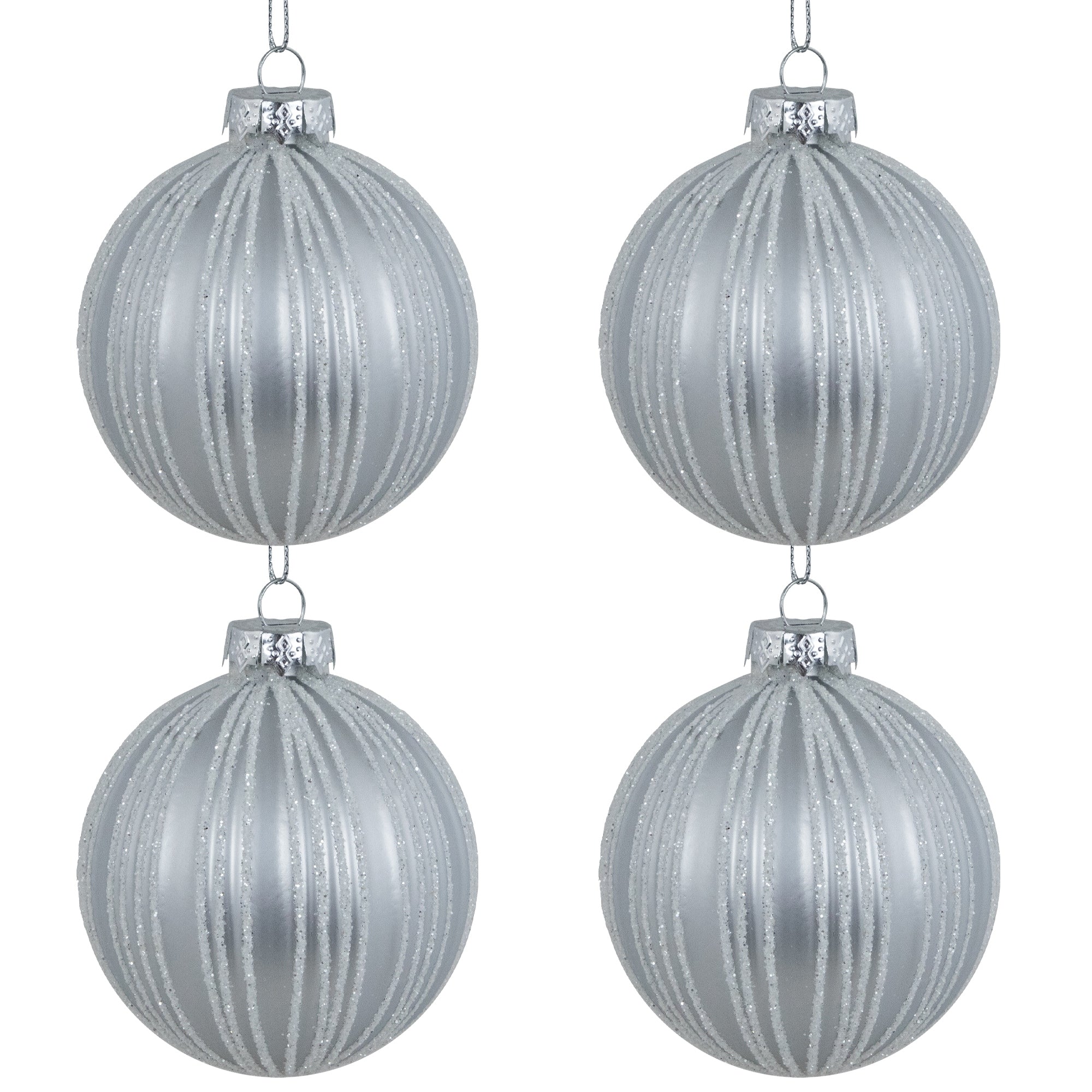 Crafted from glass, each ornament features a pristine silver base adorned with delicate and mesmerizing white glitter stripes. The interplay of white and shimmering tones creates a stunning visual effect, reflecting the joy and magic in a winter wonderland. Hang these enchanting ornaments on your tree and watch as they catch the rays of your Christmas lights, casting a radiant glow throughout your home.