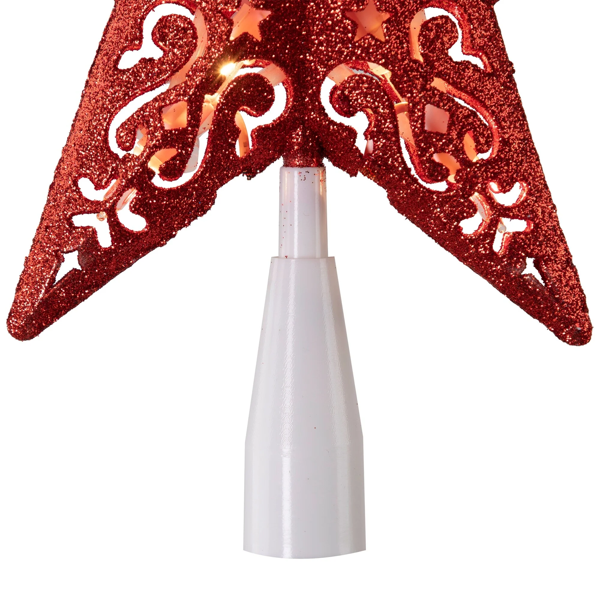 This glittered star Christmas tree topper is sure to add a festive sparkle to your holiday decor. This star is lit with clear lights and decorated with red glitter for an extra special touch. Add a touch of festive cheer to your tree this holiday season with this beautiful tree topper!