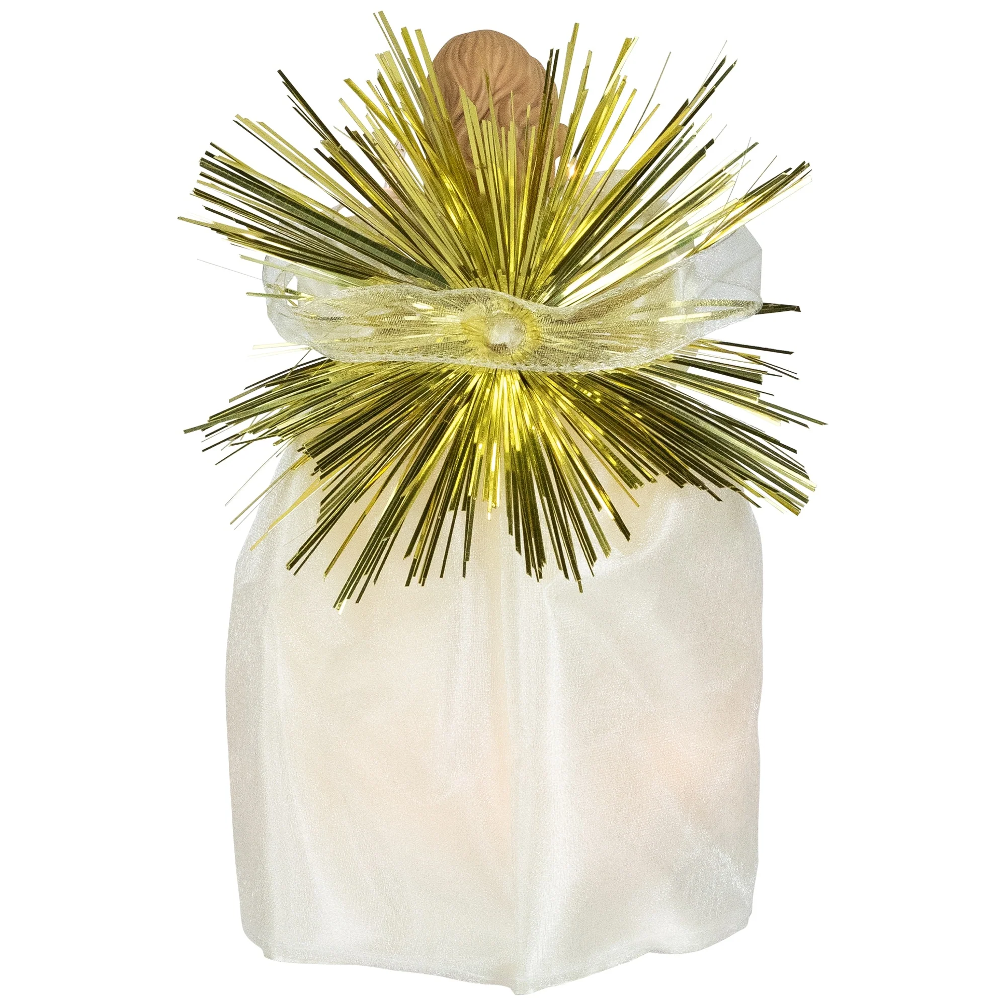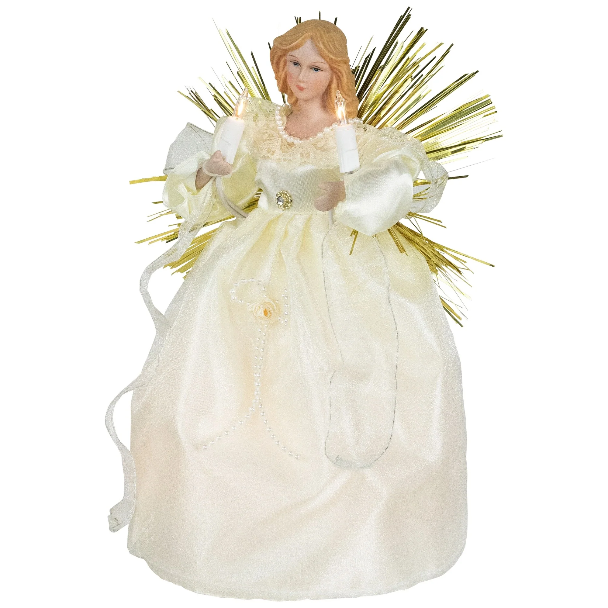 Add a touch of heavenly elegance to your Christmas décor with our lighted angel Christmas tree topper. Adorned in a cream dress delicately embellished with lace and pearl accents, this celestial guardian adds a touch of elegance to your holiday decor. With a flickering candle in hand, she casts a warm and inviting glow, creating a serene atmosphere in any room. Her wings, crafted from a spray of shimmering gold tinsel, sparkle with the magic of the season. Let this celestial beauty be the crowning glory of your holiday festivities, bringing joy and wonder to your home year after year.