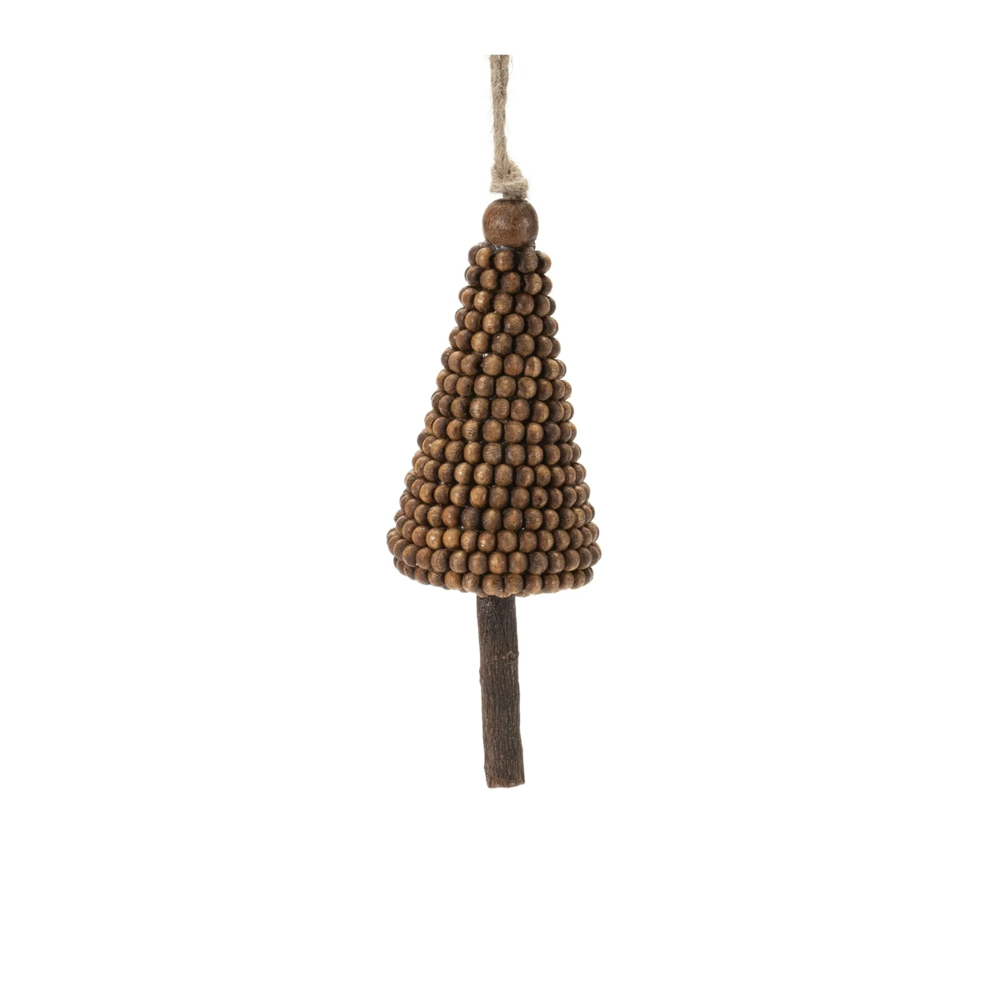 Embrace woodland charm this holiday season with the beaded tree ornaments. These charming ornaments, crafted from plastic and wood in earthy brown tones with a natural wood grain finish, feature a modern cone pine tree design adorned with rustic beaded accents and a twig stem. The jute string hanger enhances their natural aesthetic, making them perfect for decorating your Christmas tree, wreaths, or garlands.