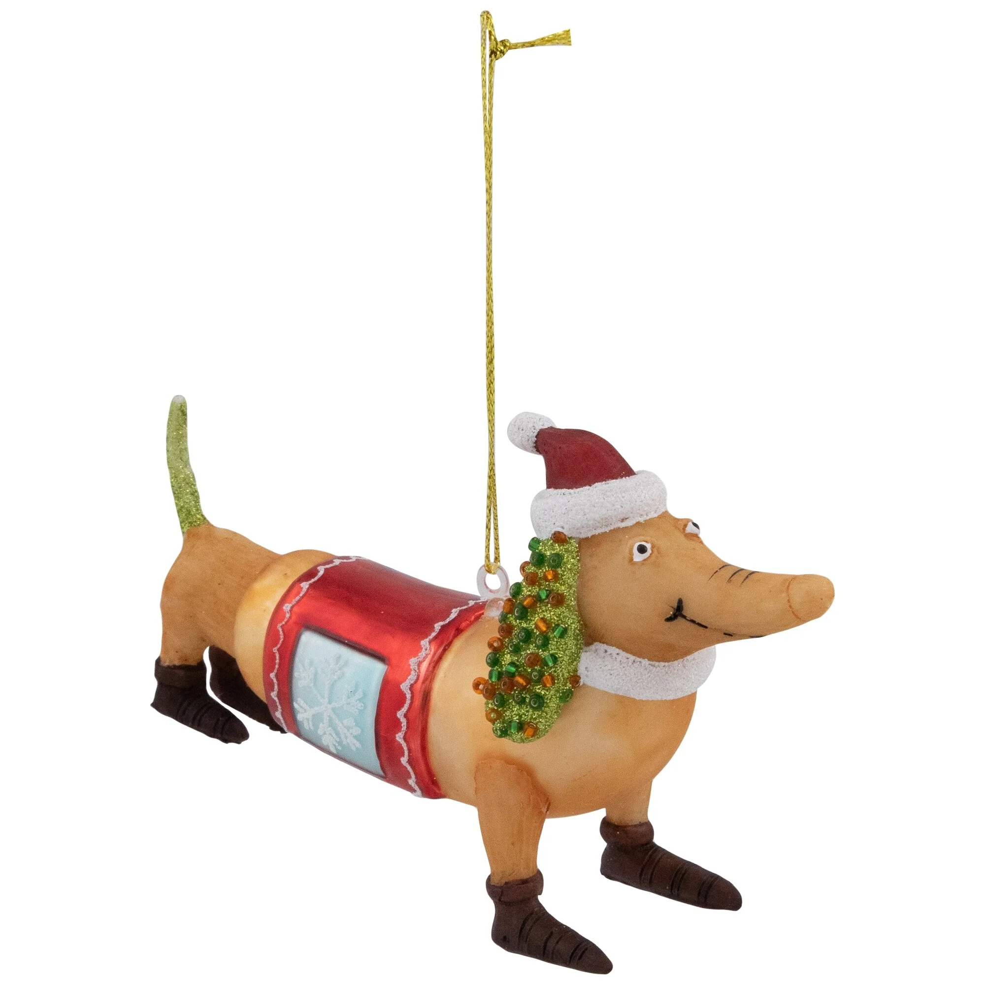 Add a dash of holiday charm to your Christmas tree with our adorable glass dachshund ornament. This ornament features a lovable dachshund wearing a Santa hat and a cozy red sweater adorned with a snowflake design. Crafted with attention to detail, this ornament sparkles with intricate beaded accents, making it the perfect addition to your holiday decor. Bring joy and whimsy to your festivities with this merry little dachshund ornament that is sure to capture the hearts of dog lovers everywhere.