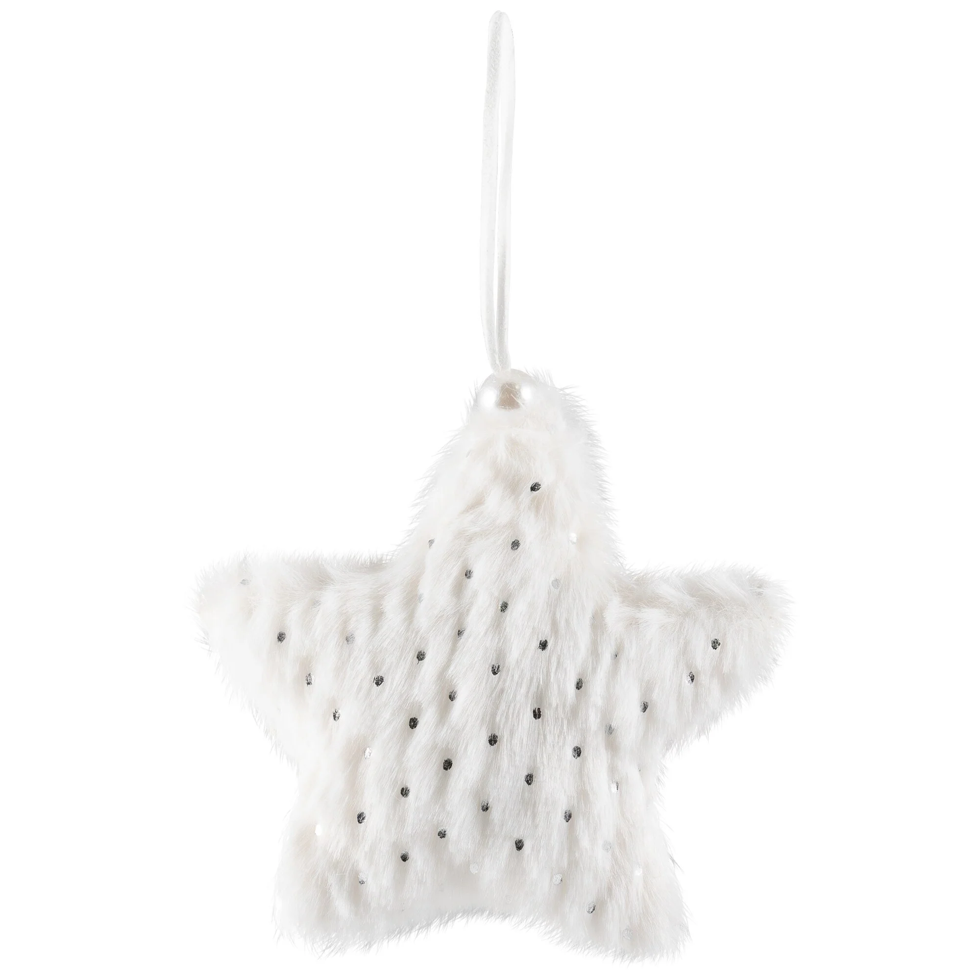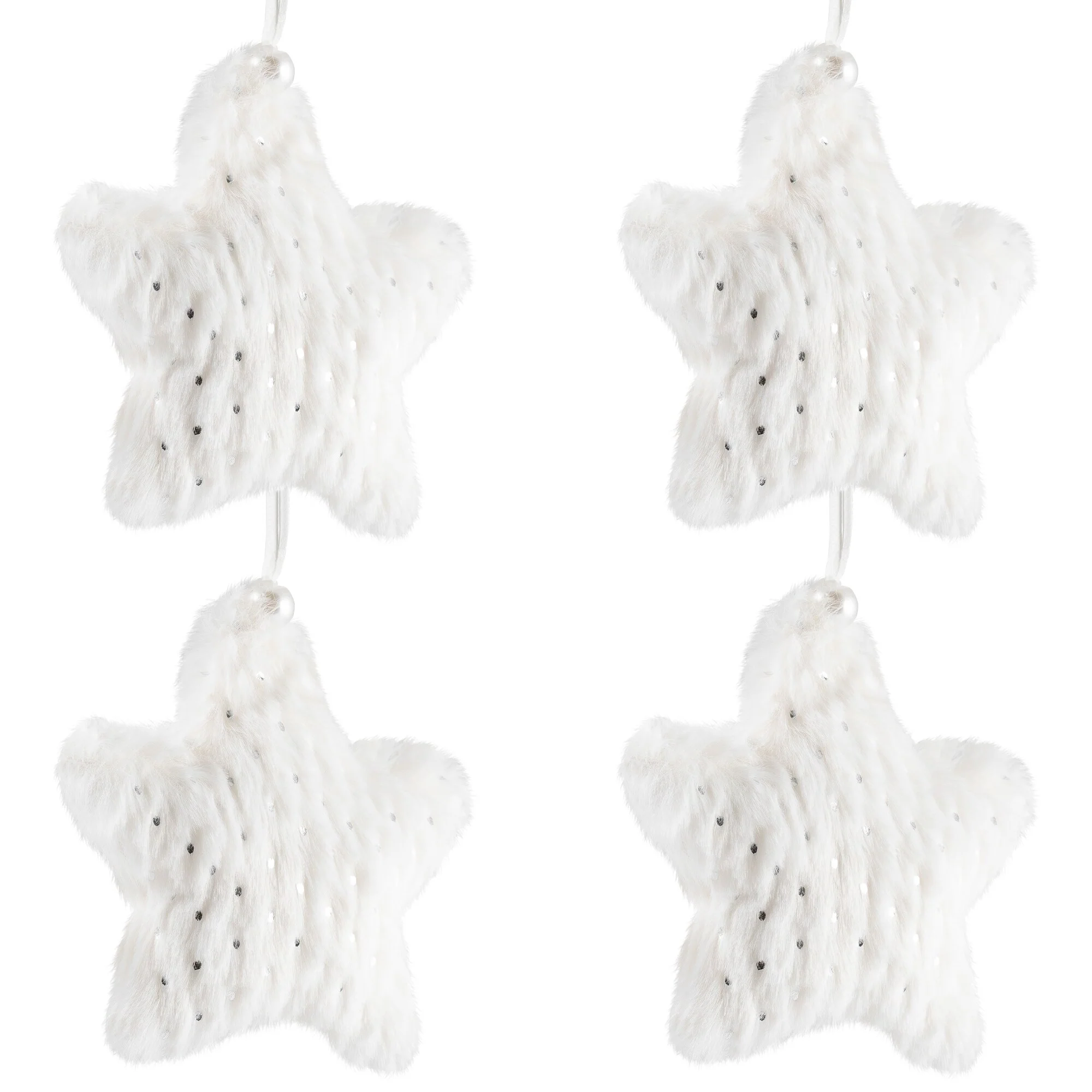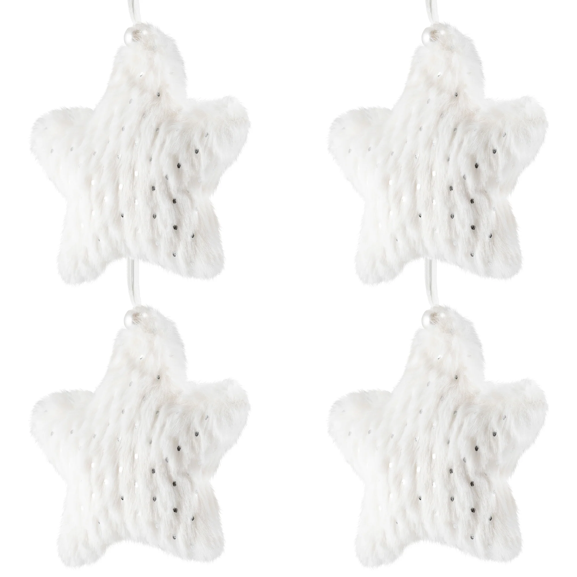 This stunning ornament set will be perfect for both Christmas and winter decorating. These white faux fur ornaments are designed in the shape of a star. Embellished with silver sequins adding sparkle anywhere they are displayed. They hang on a ribbon accented with a silver bead. Lightweight and unbreakable, these plush ornaments will last from year to year. Perfect to display on a tree, from a mantle, or in place of a bow on a gift.