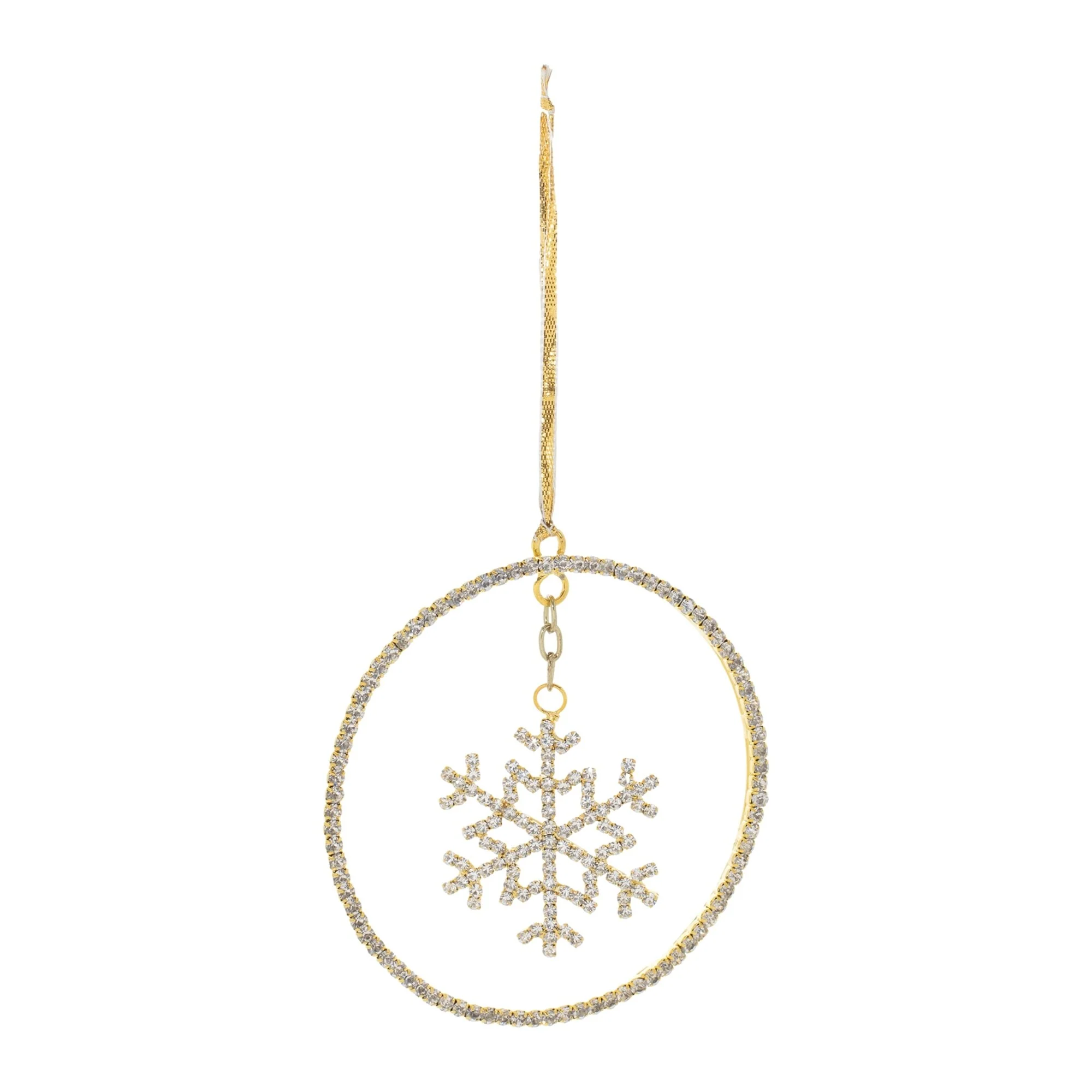 Infuse your holiday decor with a refined sparkle using the jeweled metal hanging snowflake ornament. Designed in elegant gold and gray tones, this disc-shaped ornament features a classic snowflake motif adorned with shimmering glass jewels. The slim iron frame and metallic string hanger offer a delicate, elevated look perfect for modern or traditional Christmas themes.