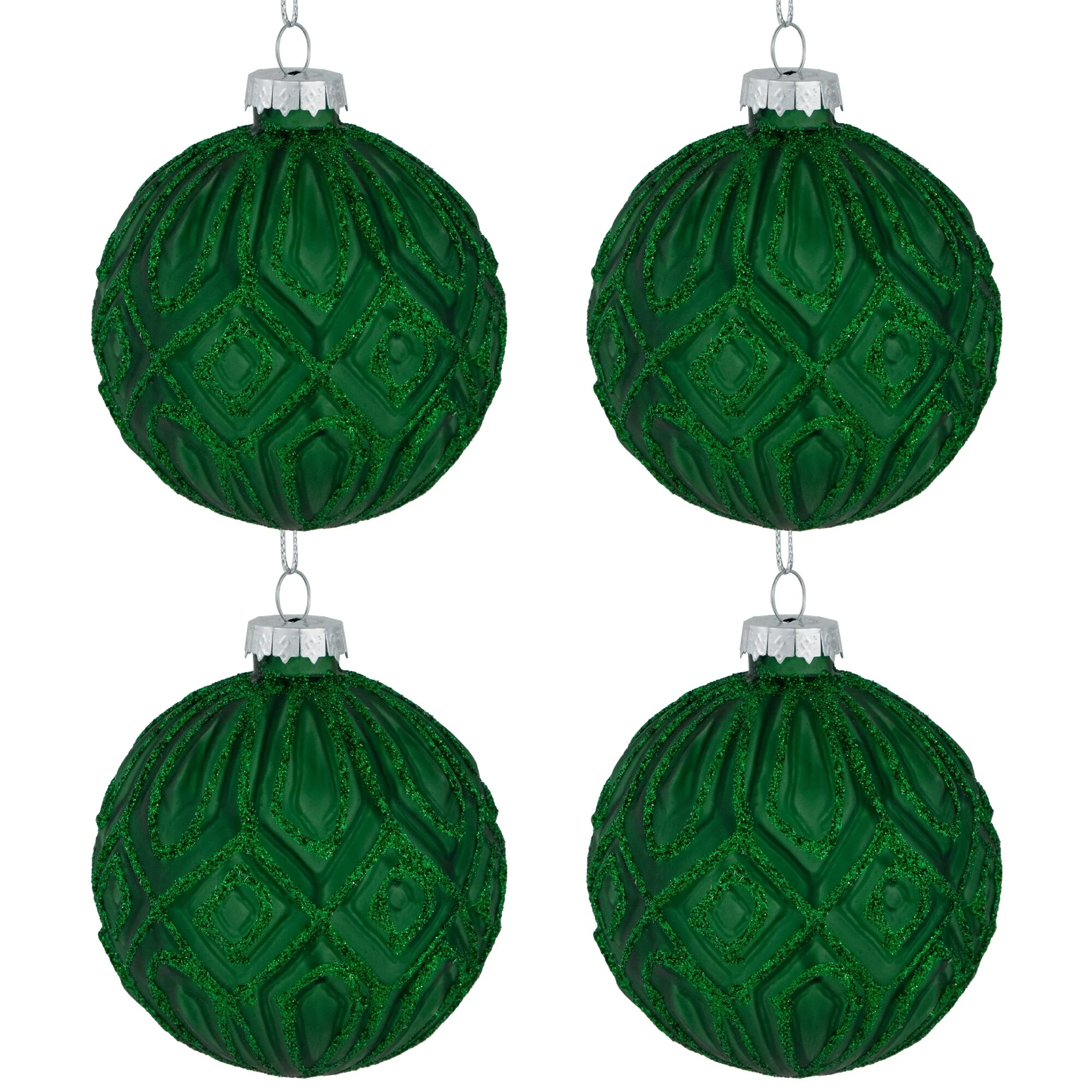 Add a touch of elegance and sparkle to your holiday with this set of glass ball ornaments. Each piece in this exquisite ornament set features a stunning textured diamond pattern with a forest green matte finish. They are delicately embellished with emerald green glitter. Hang these dazzling ornaments on your Christmas tree or adorn your home with their shimmering beauty to create a festive ambiance.