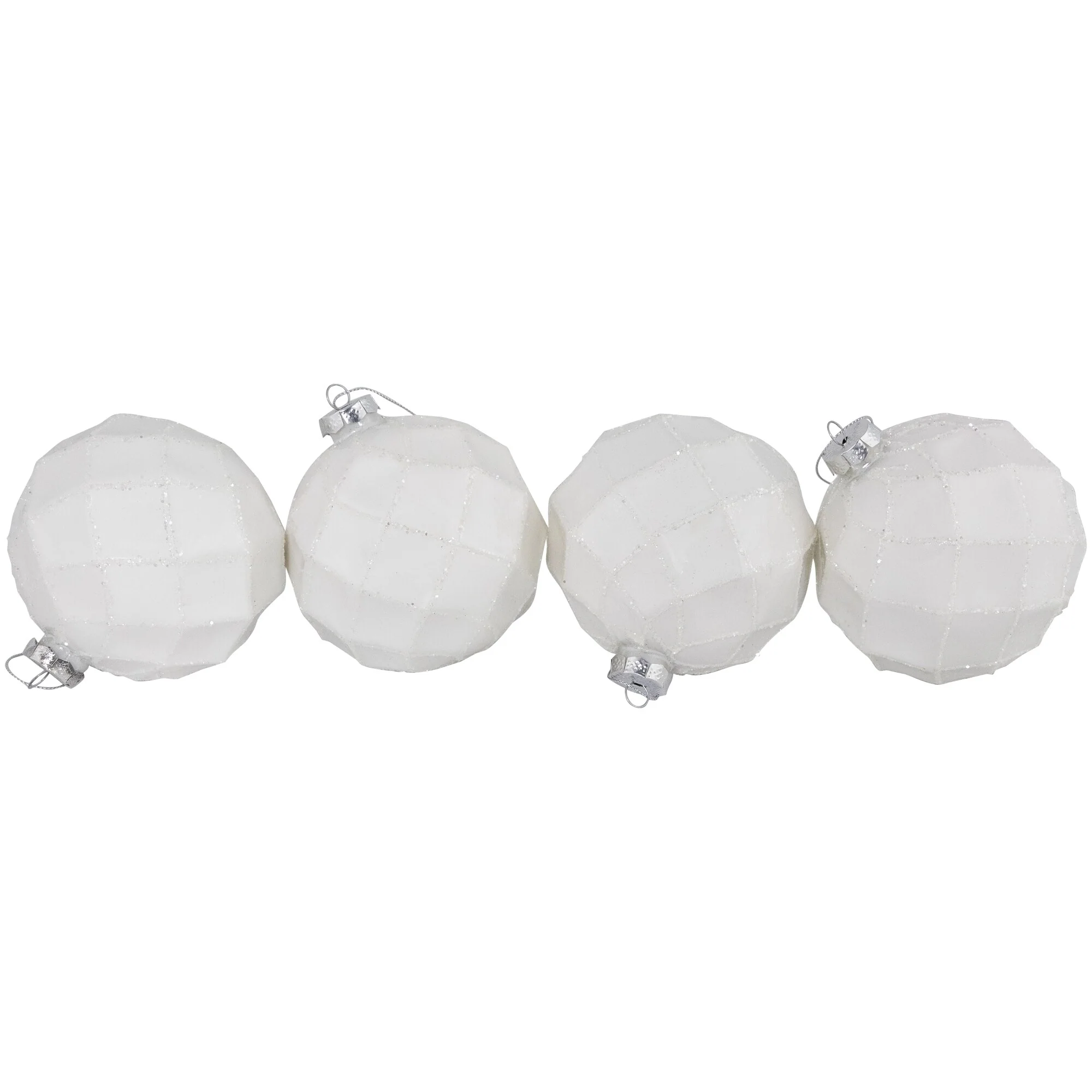 Crafted with meticulous attention to detail, these stunning ornaments feature a sleek white diamond lattice pattern, beautifully adorning their pristine glass surface. Each ornament is the perfect size to catch everyone's eye when placed on your Christmas tree. Delicately enhanced with shimmering white glitter accents, these ornaments effortlessly blend sophistication and festive charm.