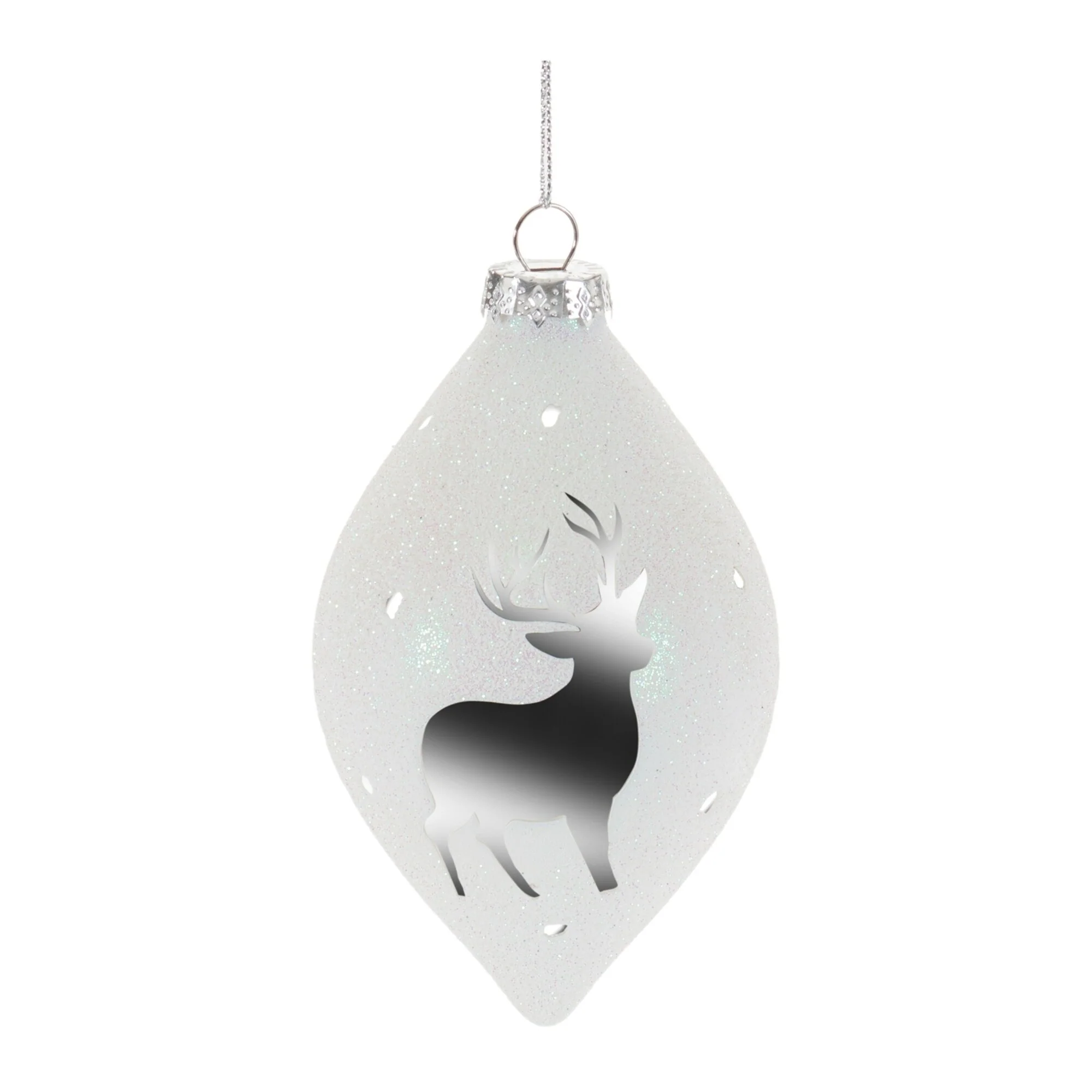 Bring rustic woodland charm to your holiday décor with this set of glittered glass deer ornaments. Featuring wintry white tones with metallic silver and glittered accents, each ornament showcases a serene deer and pine motif. Designed in classic ball and oblong shapes, they add a nature-inspired elegance to your Christmas tree, wreath, or mantle garland. Perfect for creating a cozy, festive atmosphere with a touch of refined charm.