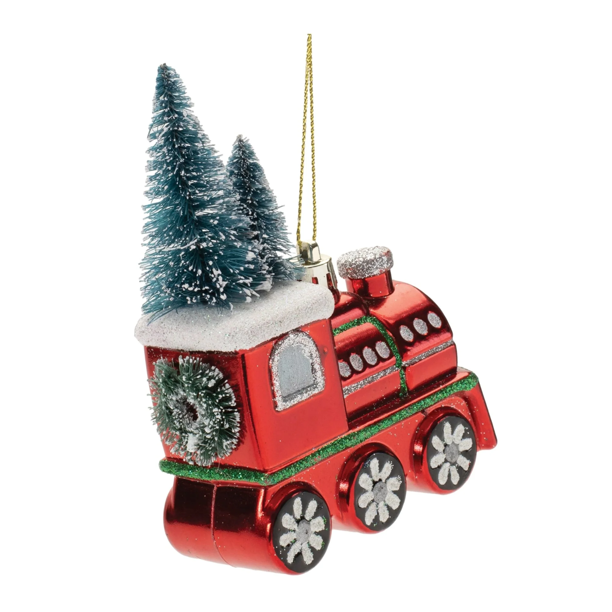 All aboard for holiday cheer with the glittered glass train ornament. This festive set features a charming train engine design in classic red and green tones, complete with snowy pine accents for a nostalgic winter touch. Crafted from plastic with a sparkling glittered finish, these ornaments capture the magic of the season with every detail. Each ornament includes a silver cap and hanging string for easy display.