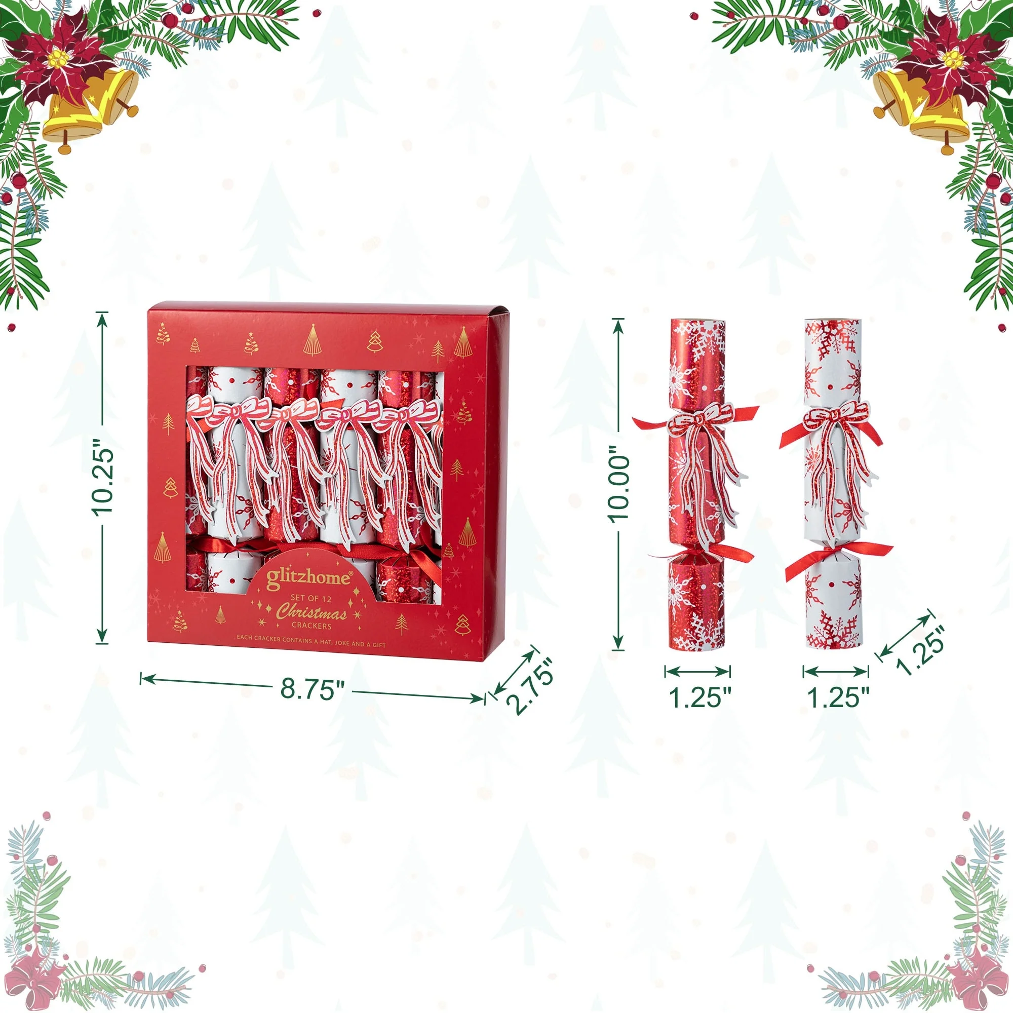 These elegant 12-pack Christmas Party Cracker, measuring 1.25 inches in diameter and 10 inches in height, are perfect for festive celebrations, features red and white snowflake patterns, complemented by a decorative bow, charming ribbons, and delightful gift contents inside. The gift contains 8 basic toys, namely 1 x dice, 1 x playing card, 1 x magnifying glass, 1 x diamond key ring, 1 x star key ring, 1 x jigsaw, 1 x fortune-telling fish, 1 x mystery calculation, additionally, there will be 4 toys may be duplicates of the ones already mentioned.