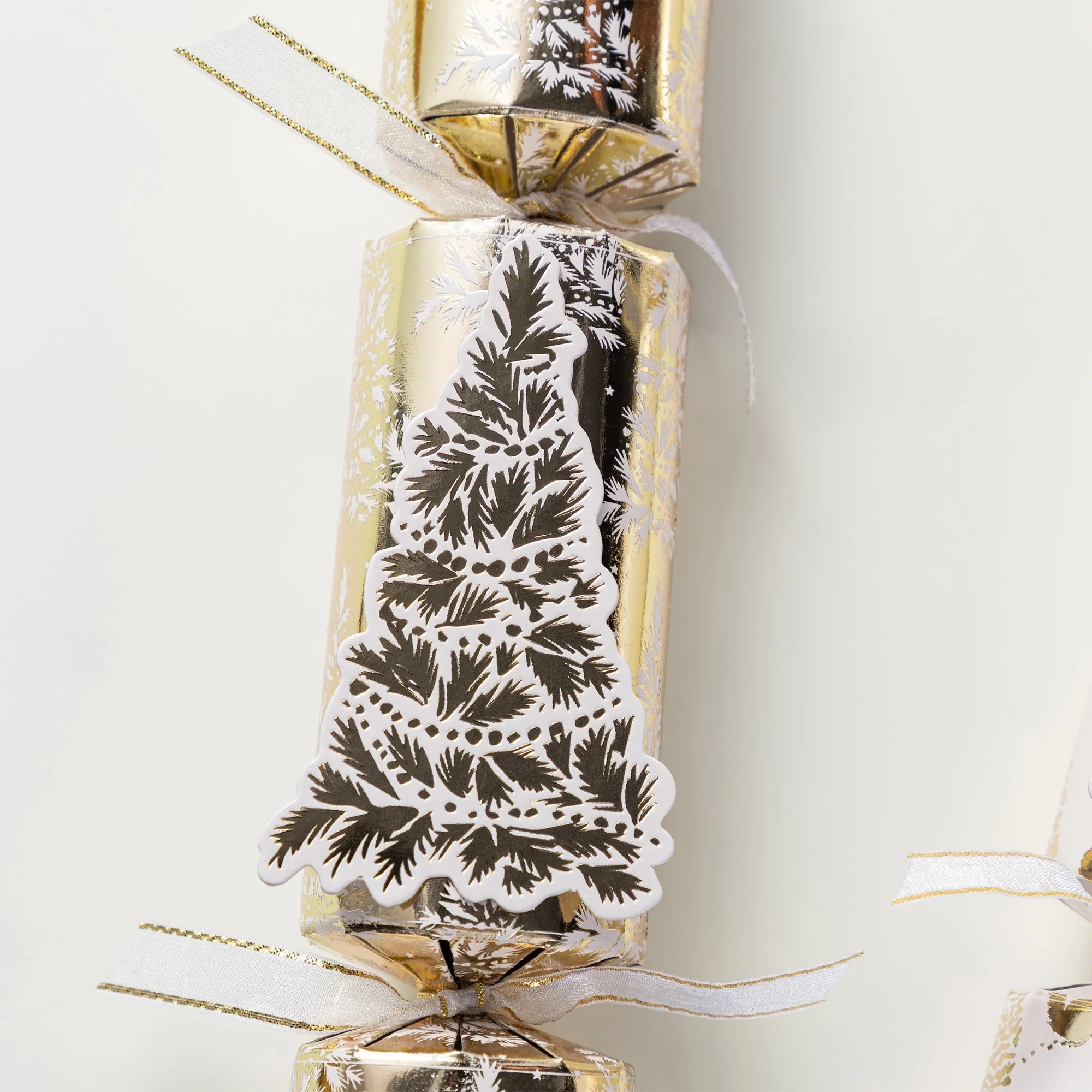 These elegant 12-pack Christmas Party Crackers, measuring 1.50 inches in diameter and 10 inches in height, are perfect for festive celebrations, featuring intricate white and gold tree designs, charming ribbons, and delightful gift contents inside. The gift contains 8 basic toys, namely 1 x dice, 1 x playing card, 1 x magnifying glass, 1 x diamond key ring, 1 x star key ring, 1 x jigsaw, 1 x fortune-telling fish, 1 x mystery calculation, additionally, there will be 4 toys may be duplicates of the ones already mentioned.