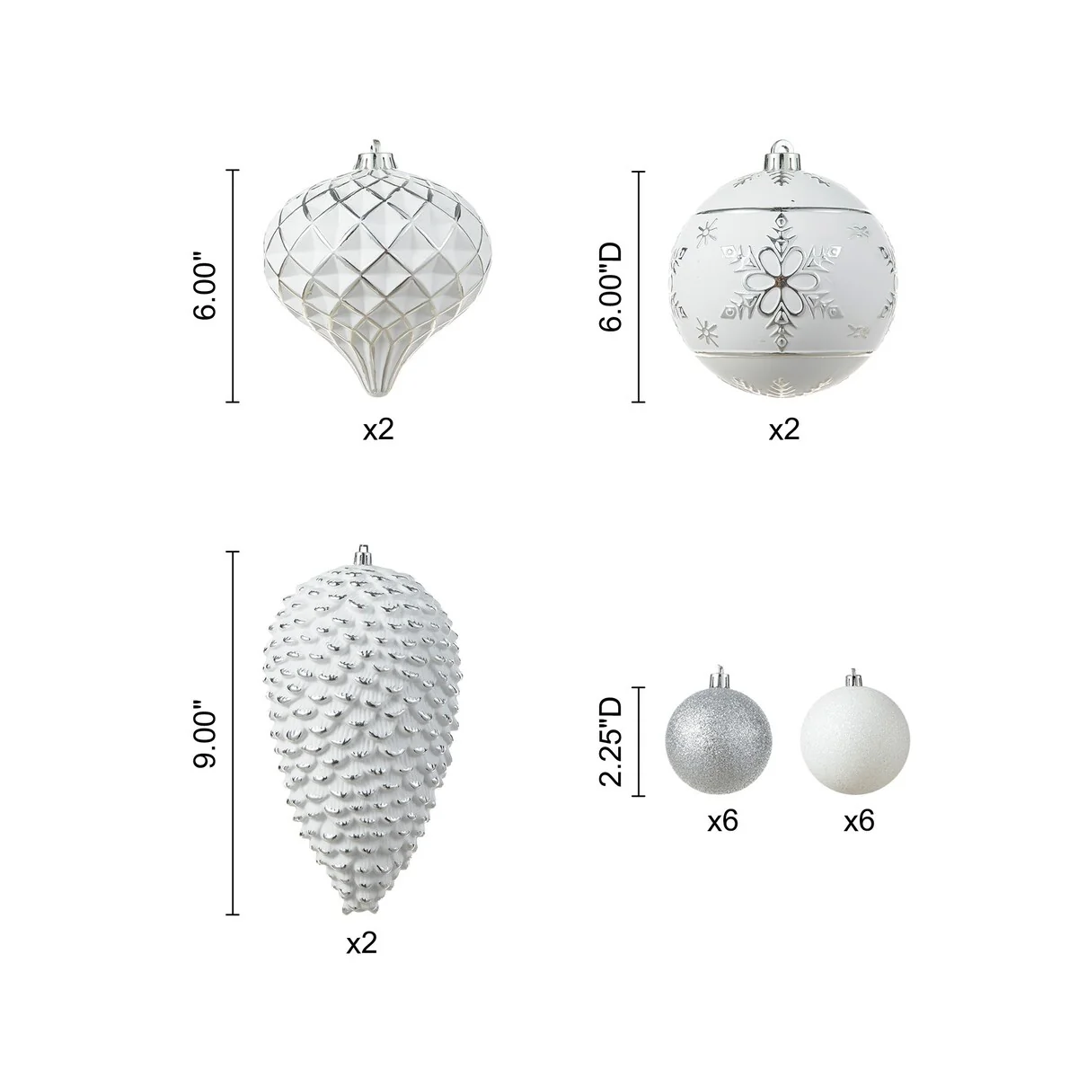The Set of 18ct Christmas Elegant Silver Deluxe Large Shatterproof Ornaments with variety of sizes and designs decoration are perfect for Christmas tree and party decoration, creating an enchanting Christmas holiday wonderland and party joyous atmosphere.