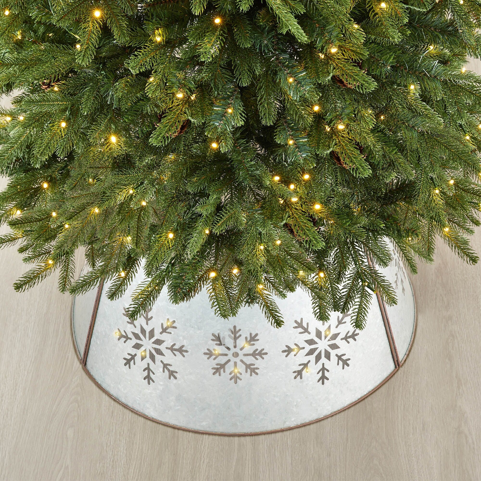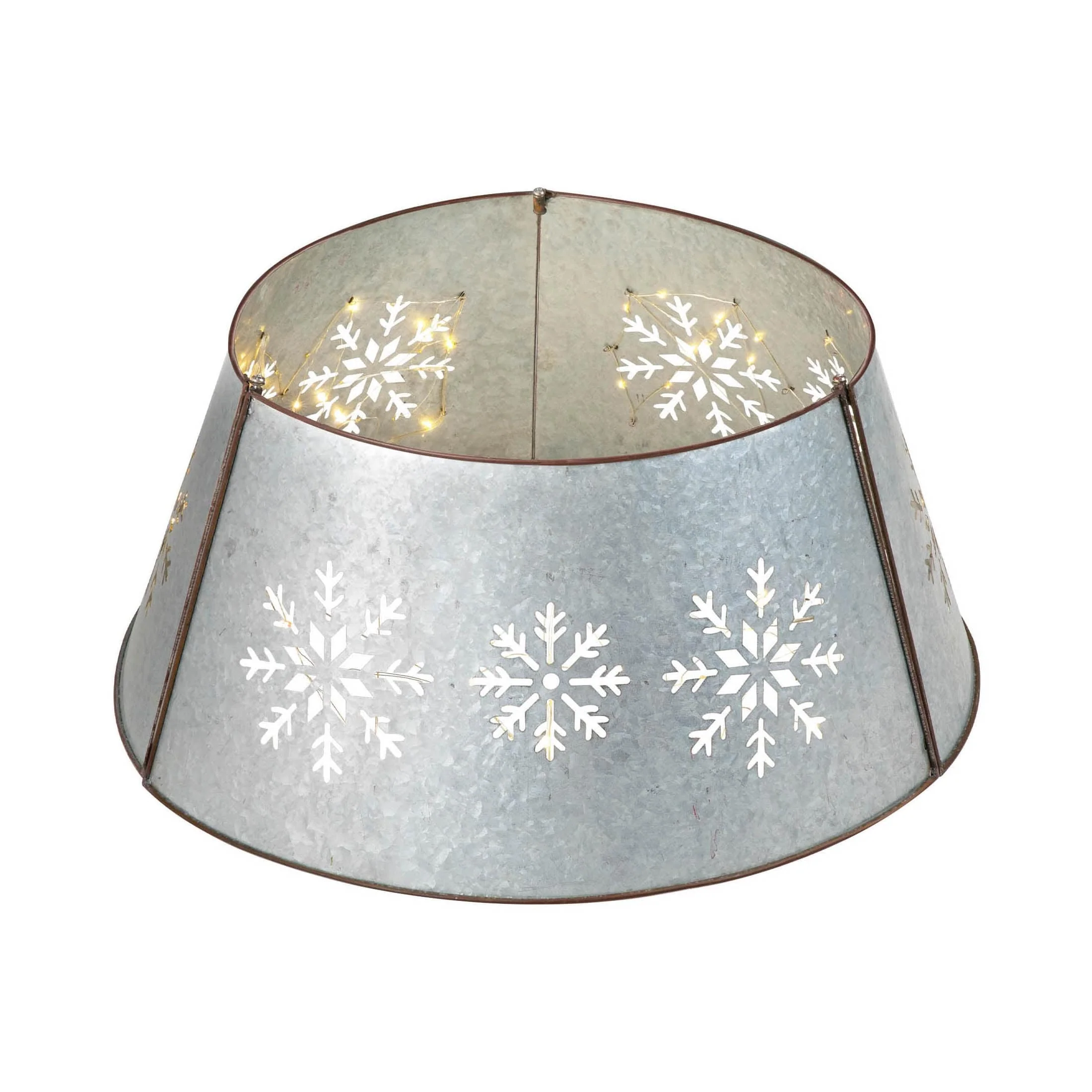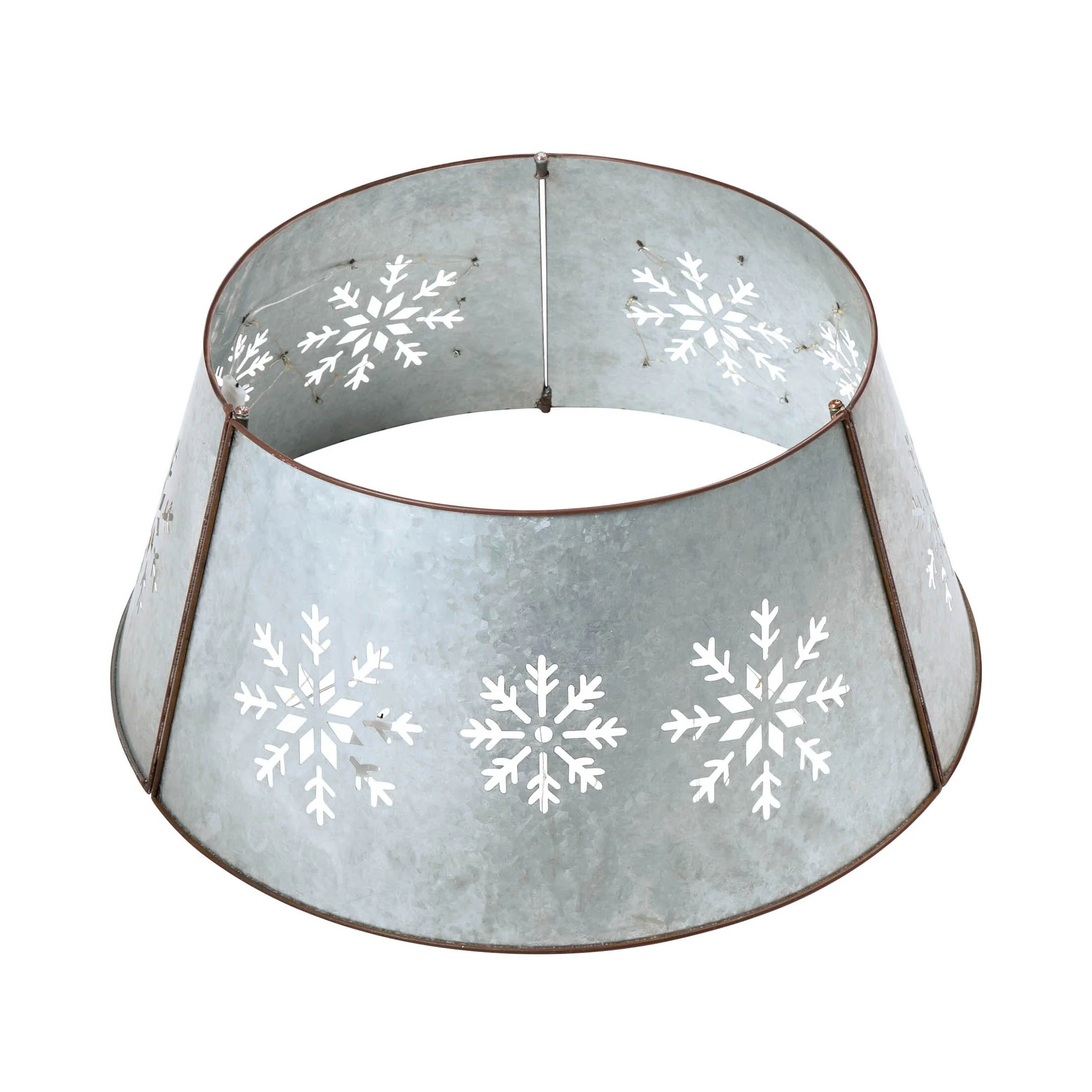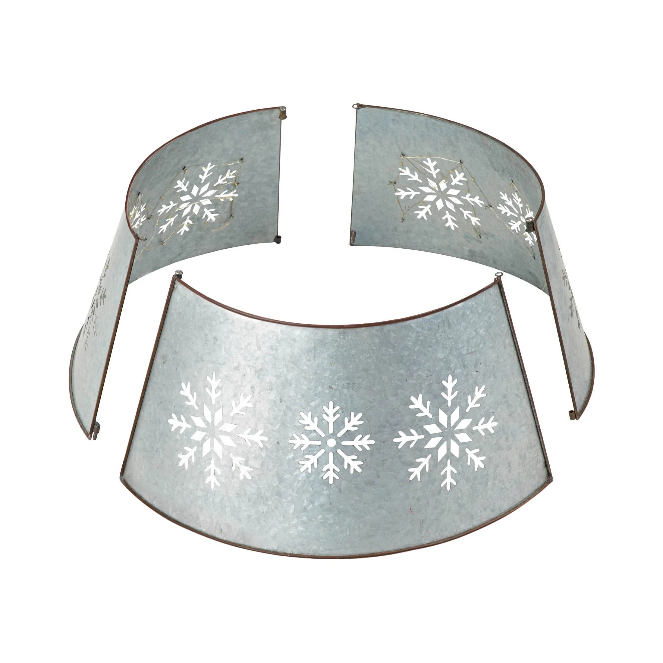 Give your Christmas tree a hint of rustic flair with this metal tree collar from Glitzhome. The flared iron collar features die-cut snowflakes and charming string lights for added whimsy. Choose from two sizes to suit your tree. 22''D tree collar is fit for 6FT high Christmas tree or Christmas trees with iron frame diameter less than 22''D. 26''D tree collar is fit for 7.5FT high Christmas tree or Christmas trees with iron frame diameter less than 25''D.