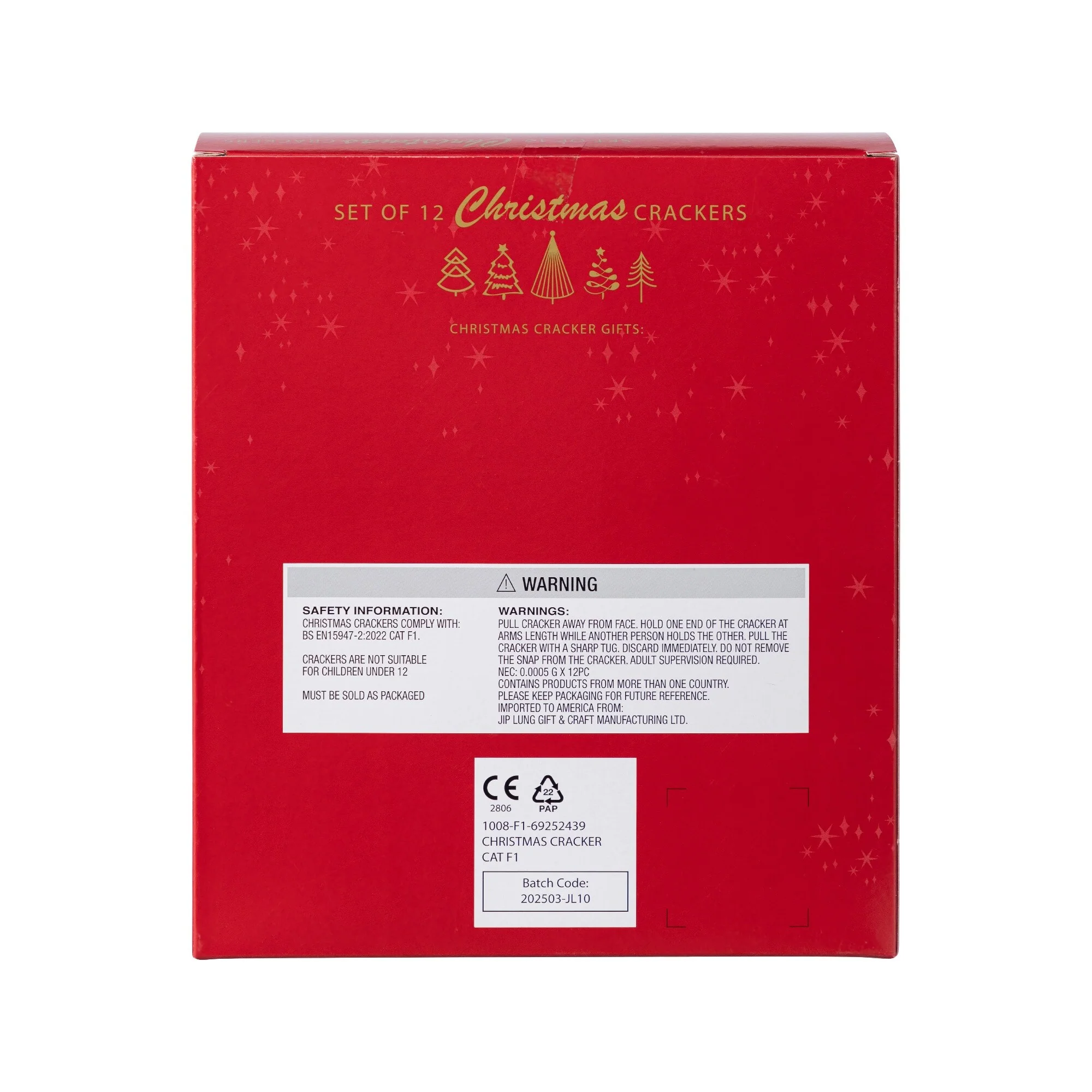 These elegant 24-pack Christmas Party Cracker, measuring 1.25 inches in diameter and 10 inches in height, are perfect for festive celebrations, featuring playful Santa and snowman designs at candy cane background, charming ribbons, and delightful gift contents inside.The gift contains 8 basic toys, namely 1 x dice, 1 x playing card, 1 x magnifying glass, 1 x diamond key ring, 1 x star key ring, 1 x jigsaw, 1 x fortune-telling fish, 1 x mystery calculation, additionally, there will be 4 toys may be duplicates of the ones already mentioned.