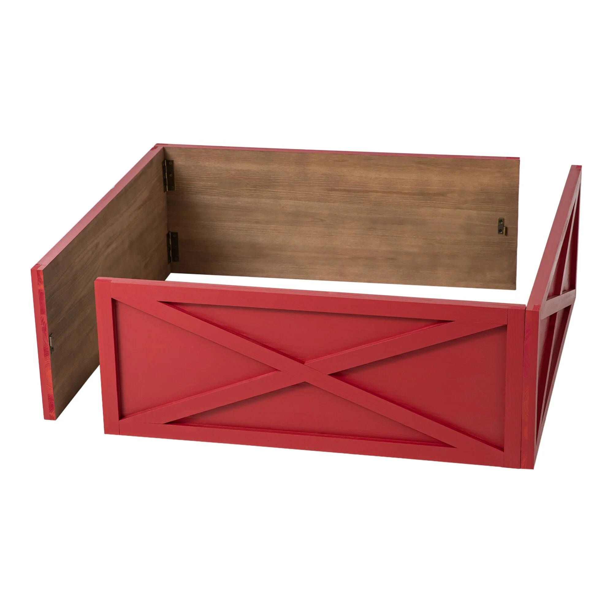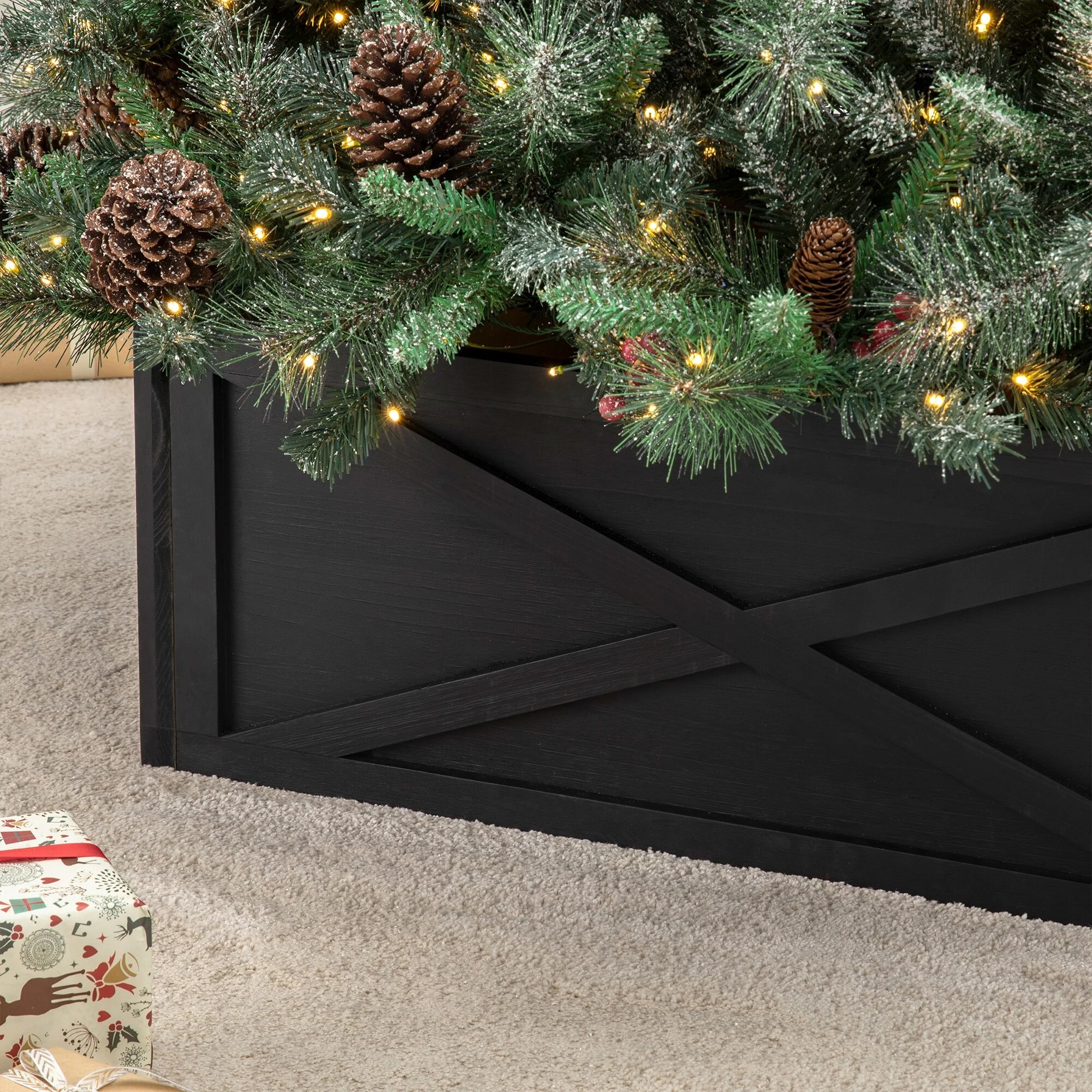 It's handcrafted from sturdy and durable solid wood, featuring X-shape design in wash white, red or black finish, brings you a modern farmhouse Christmas. Made for 11ft high trees for variety of shapes or colors. Each 2 panels has been pre-assembled with hinges and other 2 panels features right-angle bolt for easy installation, ensuring convenience and neatness.