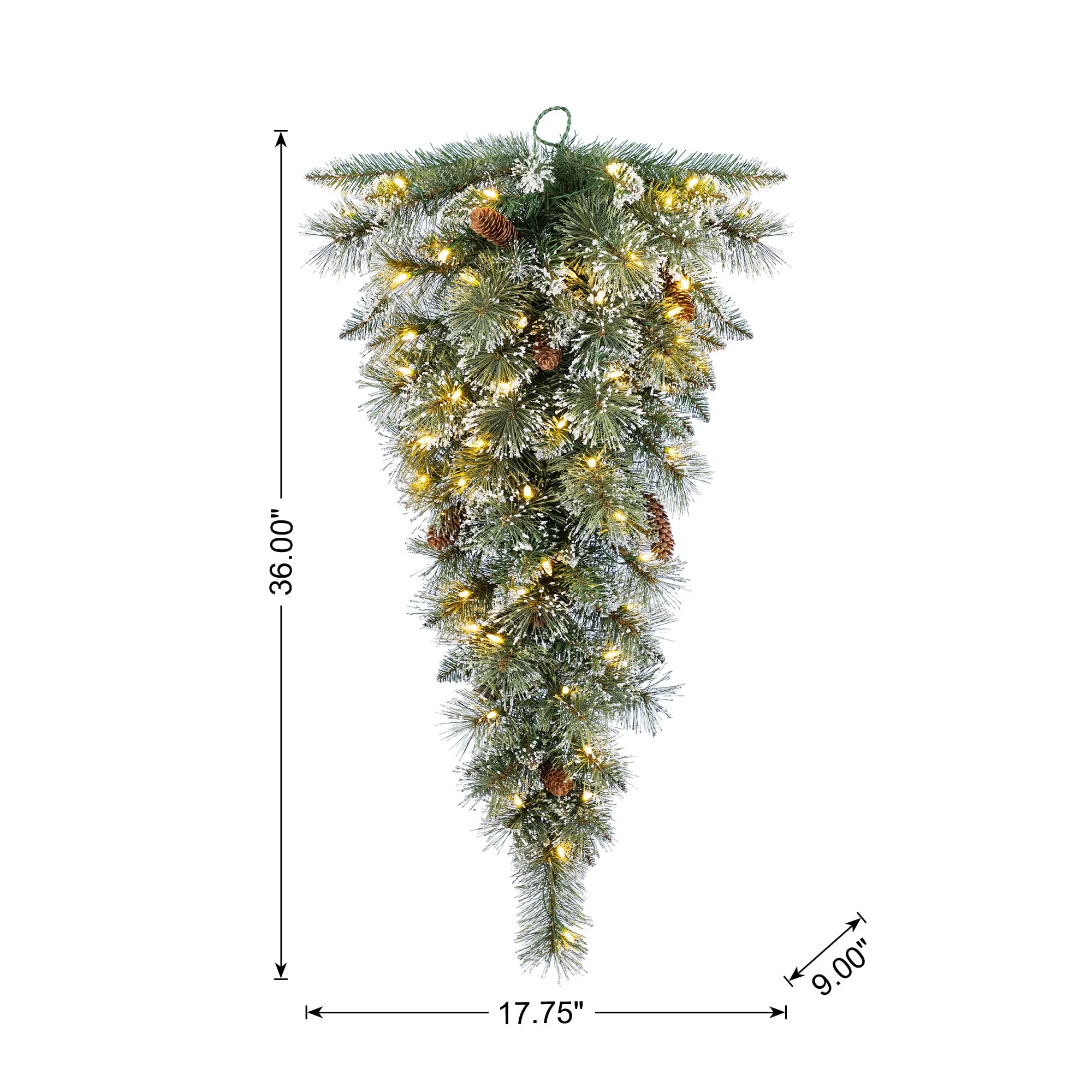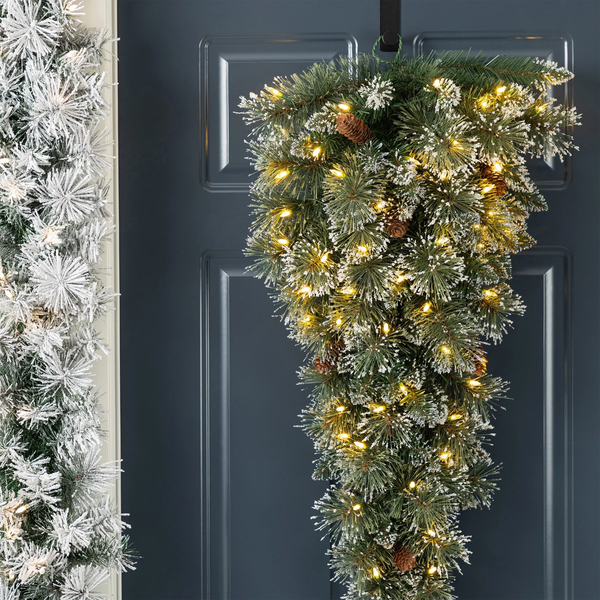 The 3ft Pre-Lit Frosted Greenery Pinecones Teardrop, with 50 C3 Clear LED Lights and Timer, features frosted greenery, realistic pine needles, and pinecones, creating a festive, wintry touch perfect for hanging on walls or doors.