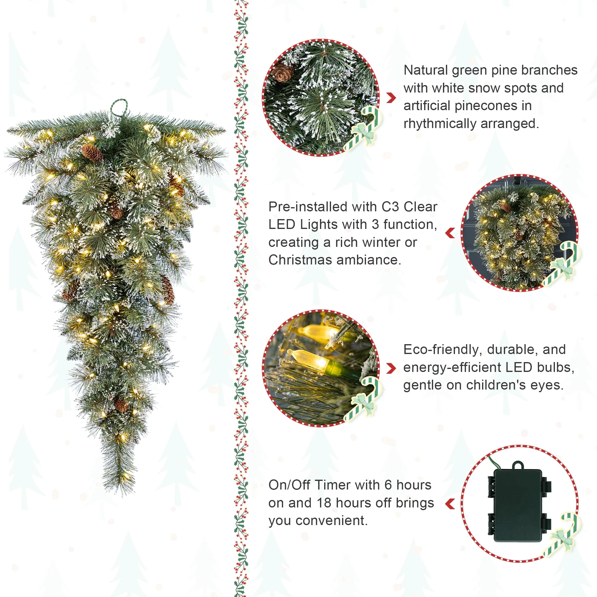 - Pre-installed with C3 clear LED lights featuring 3 modes, creating a warm winter or Christmas ambiance.