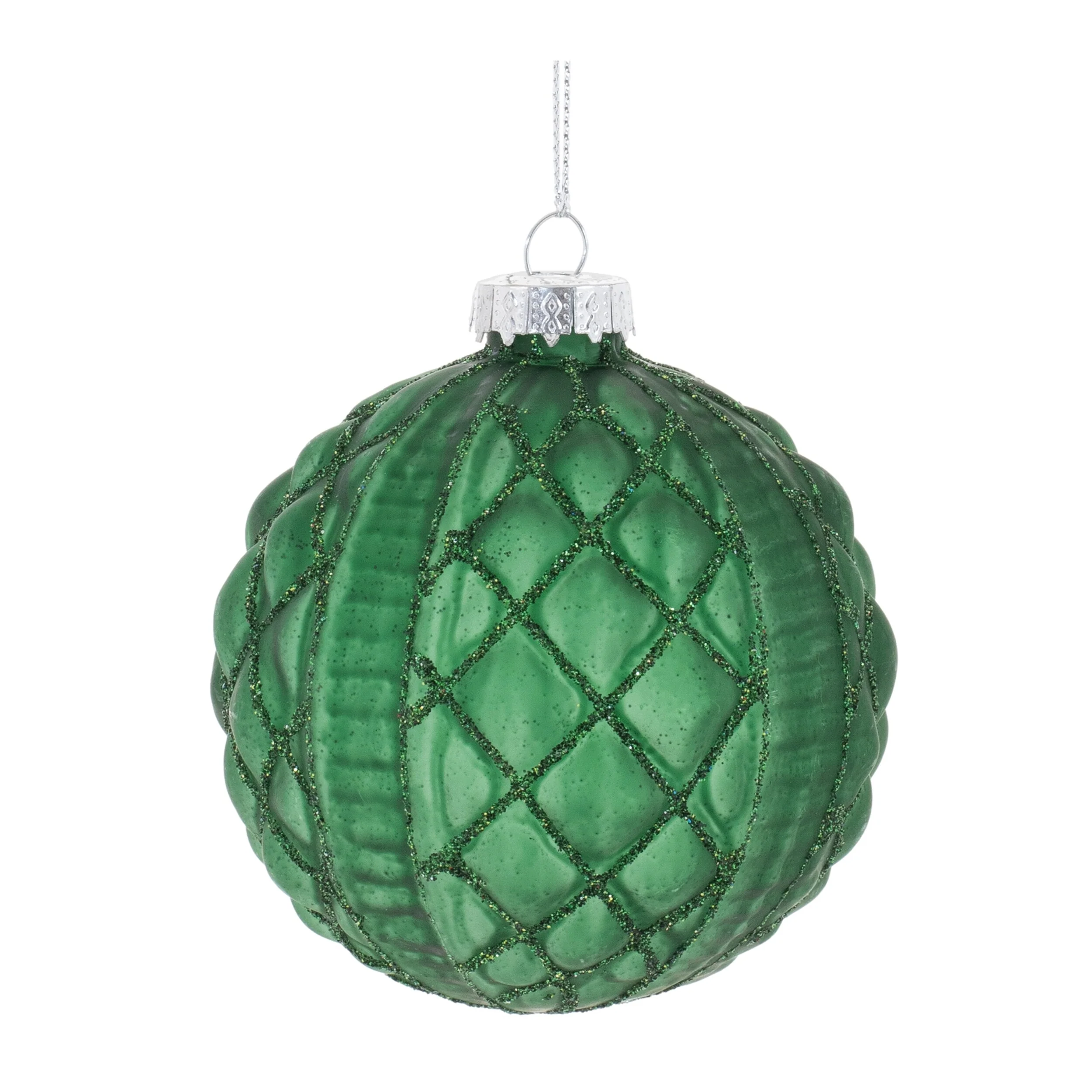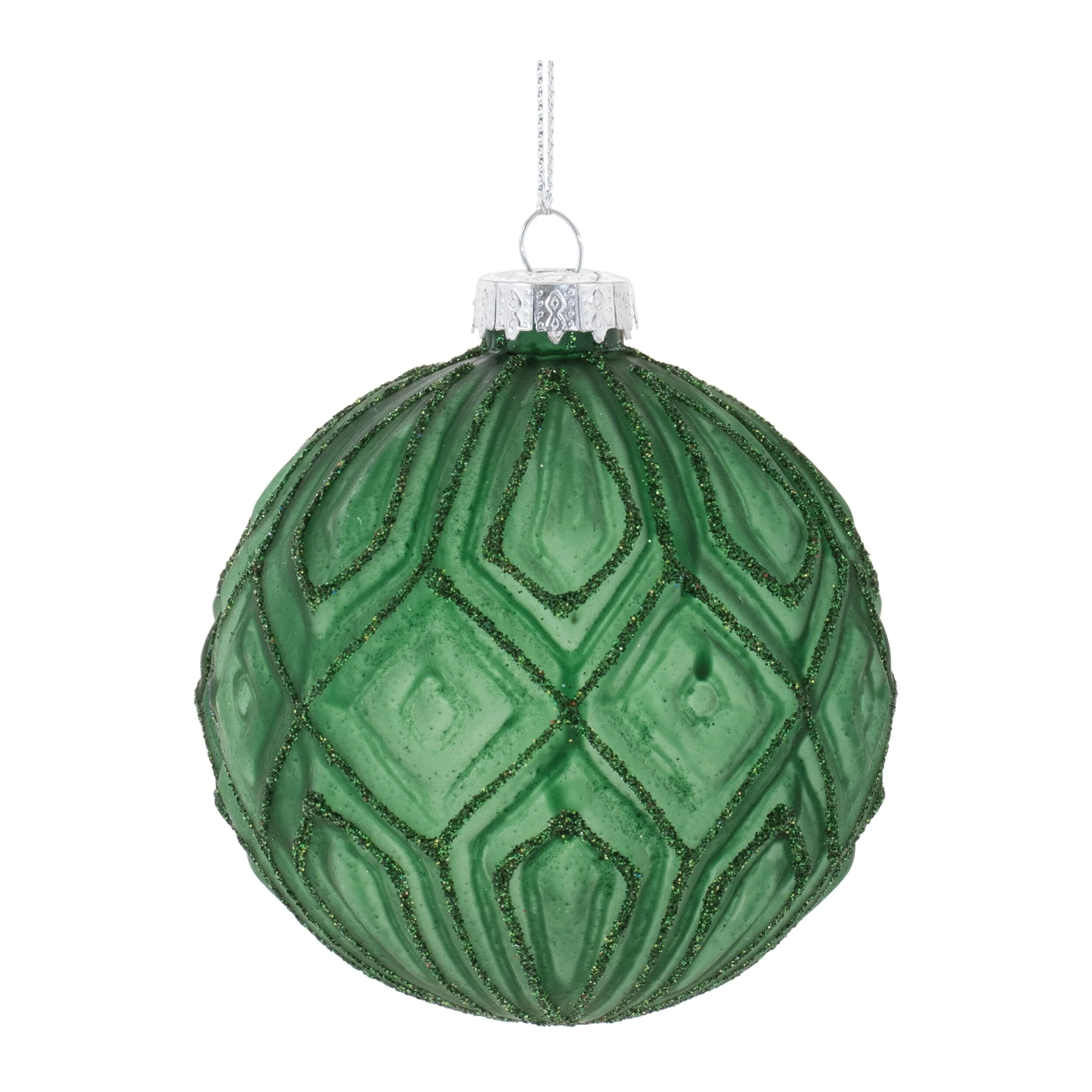 Add a touch of modern holiday cheer to your décor with these Glitter Frosted Glass Ball Ornaments. Featuring wintry green tones and glittered accents, these traditional ball-shaped ornaments boast a geometric texture and a frosted glass finish that adds a stylish touch to your Christmas tree. Each ornament comes with a delicate string hanger and a silver ornament cap, perfect for hanging on branches, wreaths, or garlands. Sold in a set of 12 pieces with two assorted designs, these ornaments will enhance any seasonal display with their stylish and festive flair.