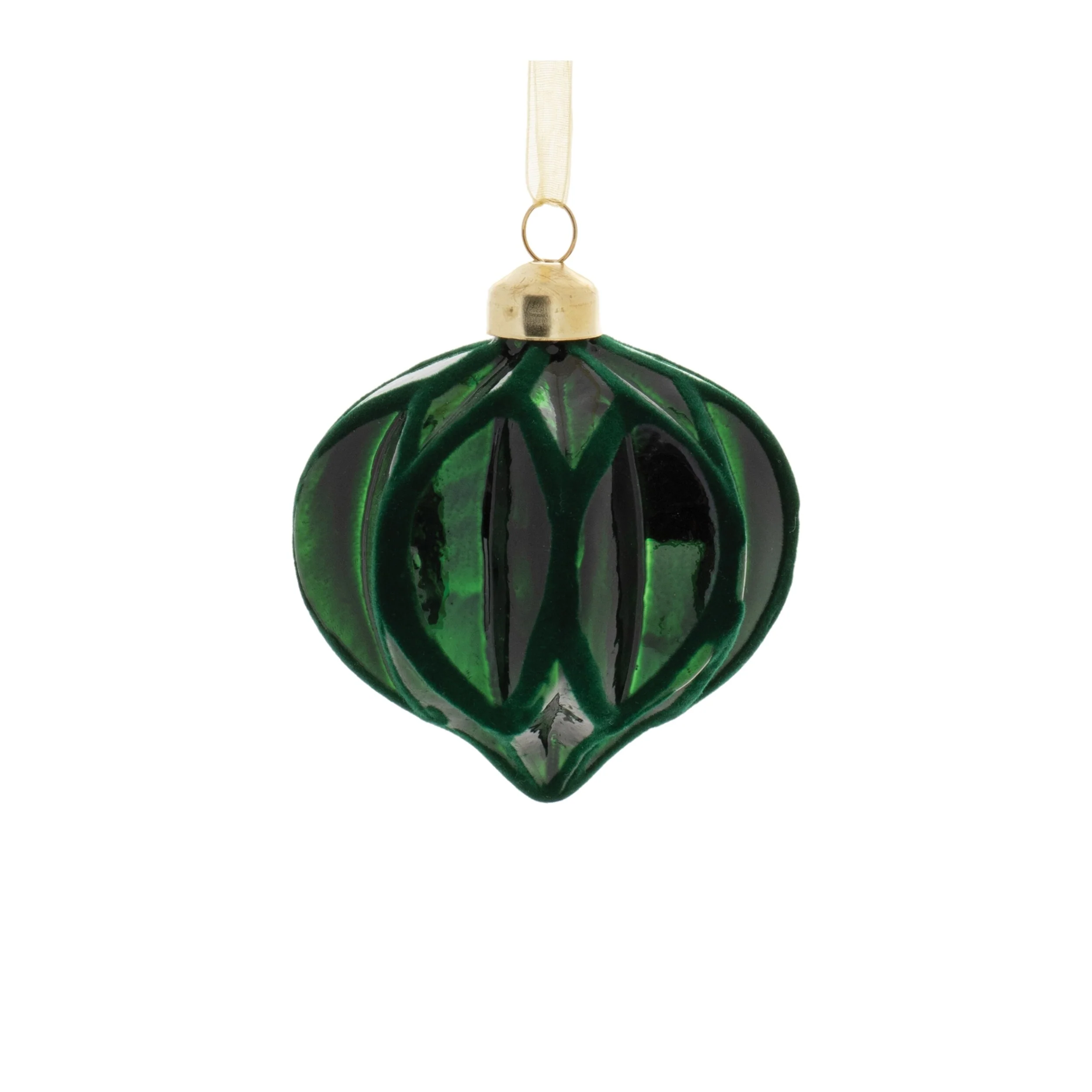 Enhance your holiday décor with the rich stylishness of this set of Velvet Glass Ornaments. Featuring a deep forest green hue with soft velvet accents, these ornaments come in three classic shapes—ball, onion, and oblong—each adorned with a sophisticated geometric ribbed texture. A delicate ribbon hanger and gold ornament cap add a refined touch, making them perfect for creating a luxurious, festive atmosphere. Sold in a set of 6 with three assorted designs, they are perfect for enhancing your Christmas tree or weaving into wreaths and garlands. Whether adorning your tree or creating a stunning seasonal display, these ornaments bring timeless holiday cheer to your home.