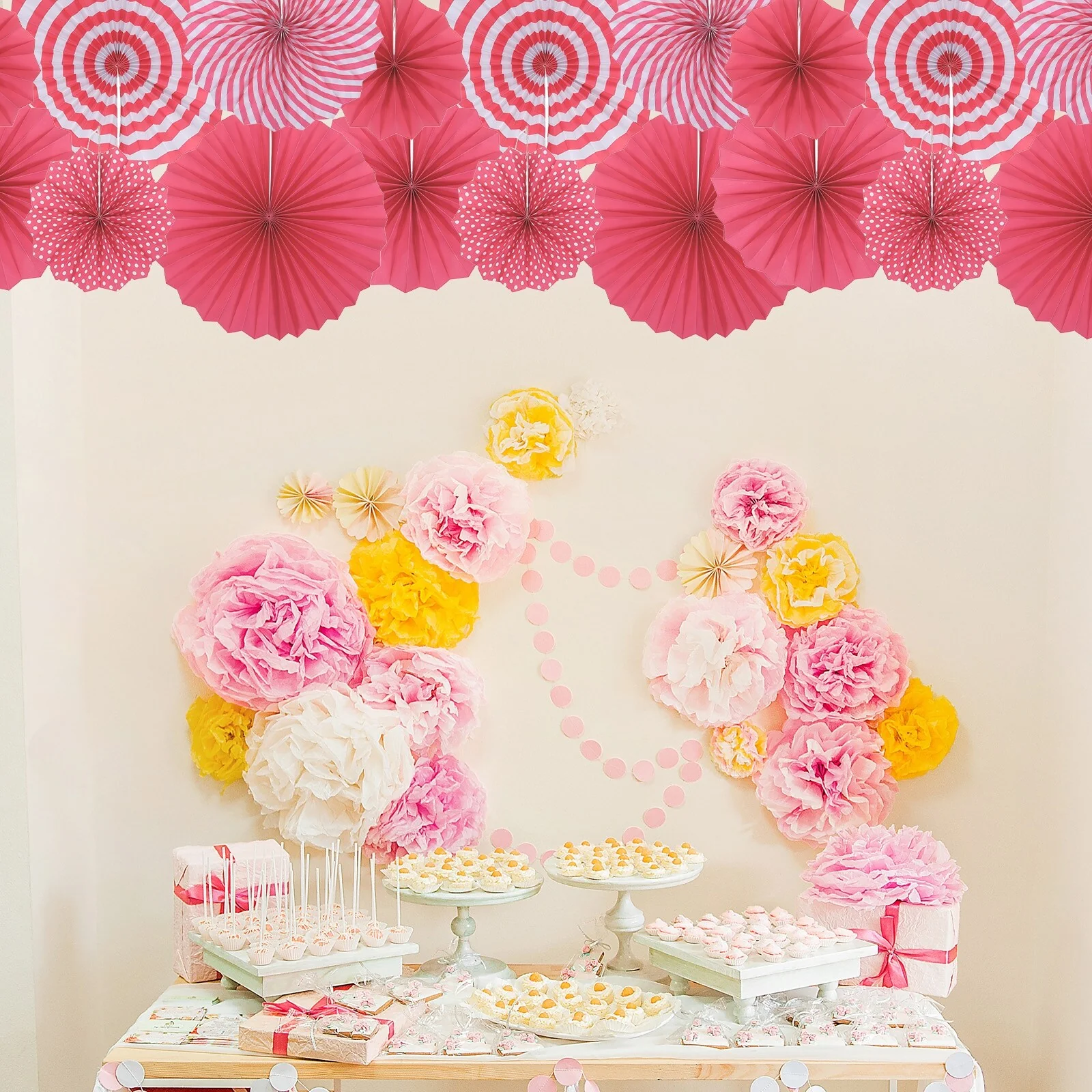 Hanging paper fans set are decor for home,party,birthday,wedding,graduation events, shop window dressing, halloween, christmas,etc.They can be attached to walls, hung on trees, trees, ceilings, curtains or doors, and above tables.