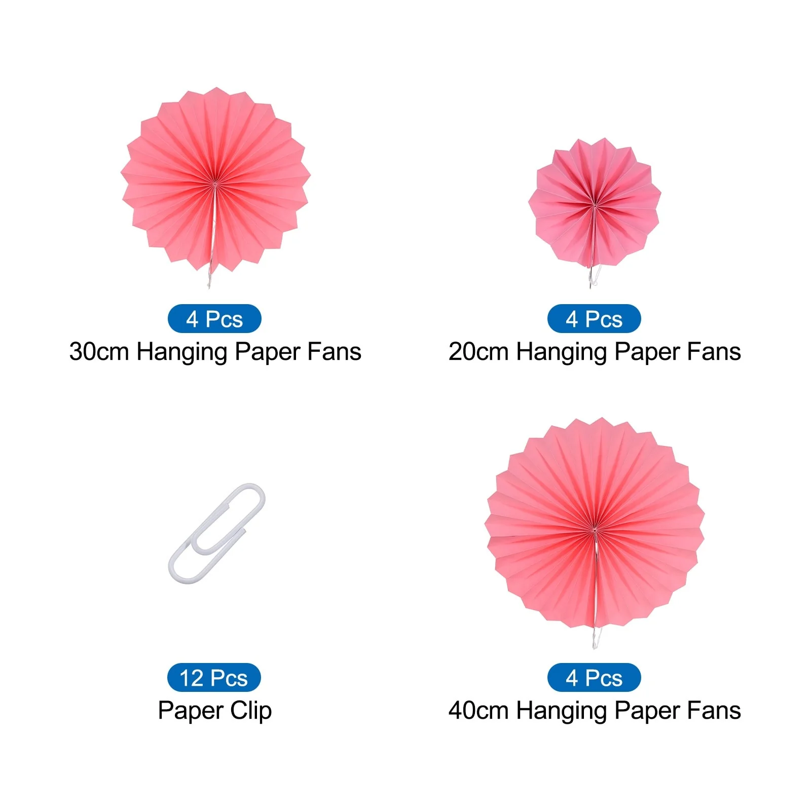 Paper fans decoration set ,Size:15.74inchx4pcs+11.81inchx4pcs+7.87inchx4pcs ;Color:Pink;Material:Paper;In the package of: 12 x Hanging Paper Fans,12 x paper clip;