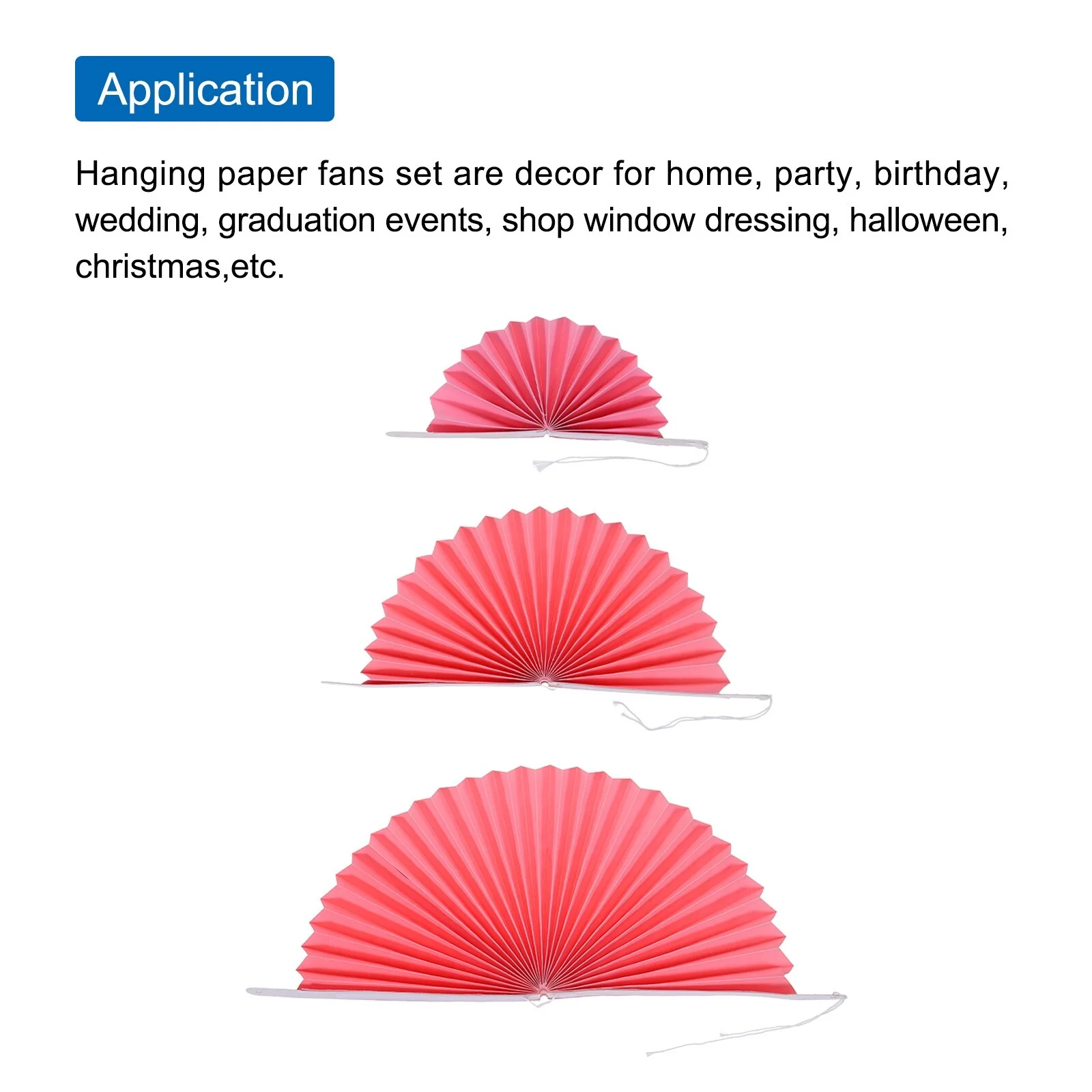 Hanging paper fans set are decor for home,party,birthday,wedding,graduation events, shop window dressing, halloween, christmas,etc.They can be attached to walls, hung on trees, trees, ceilings, curtains or doors, and above tables.