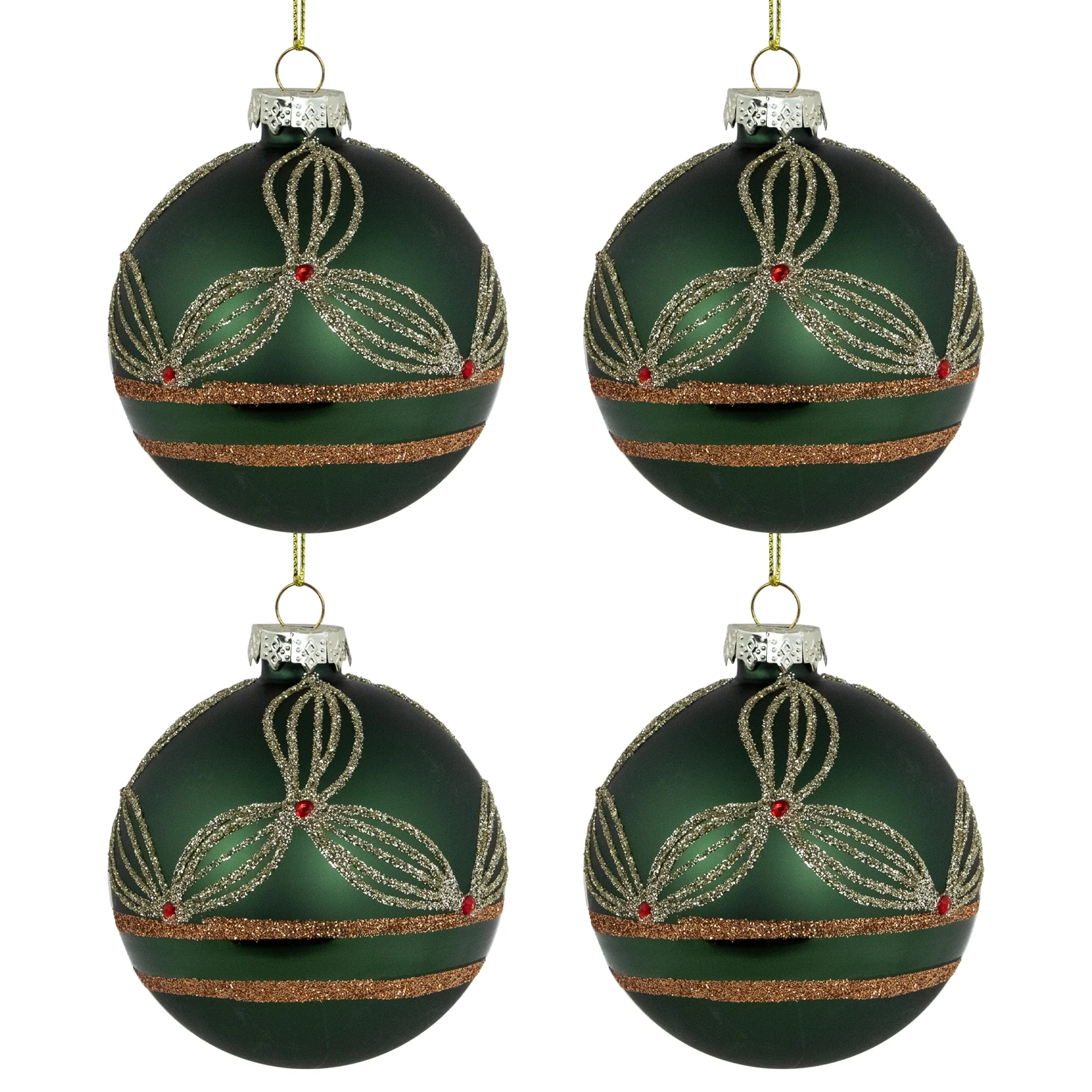 Add a touch of elegance to your Christmas tree with this exquisite set of glass ball ornaments. These stunning ornaments are delicately crafted with an intricate holly design in gold glitter, accented with a ruby red faux gem in the center, depicting red berries. The matte green shade of the ornament evokes sophistication and a sense of the forest's nature, making them a perfect addition to any holiday décor. Hang them on your tree and watch as they beautifully catch the light, creating a festive atmosphere.