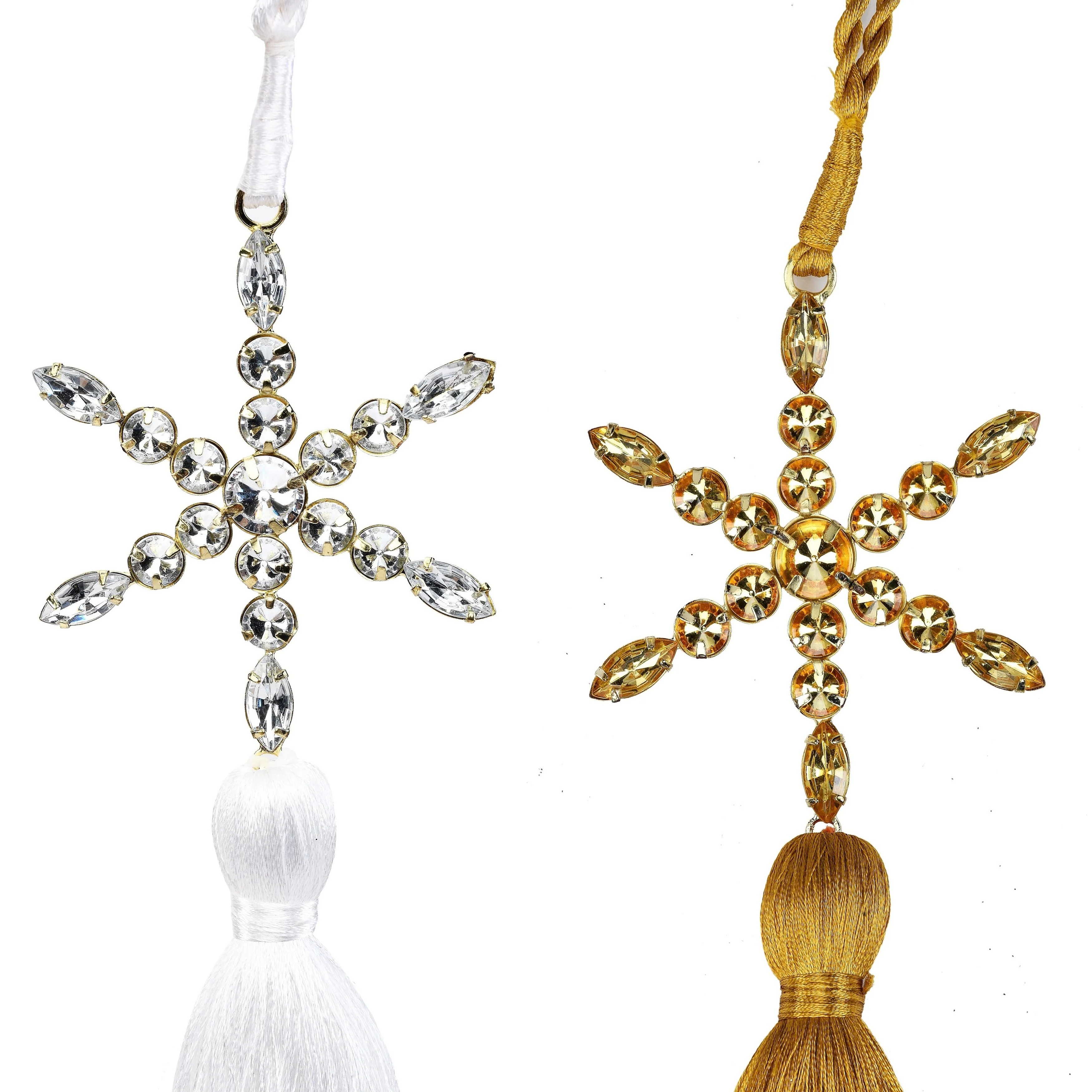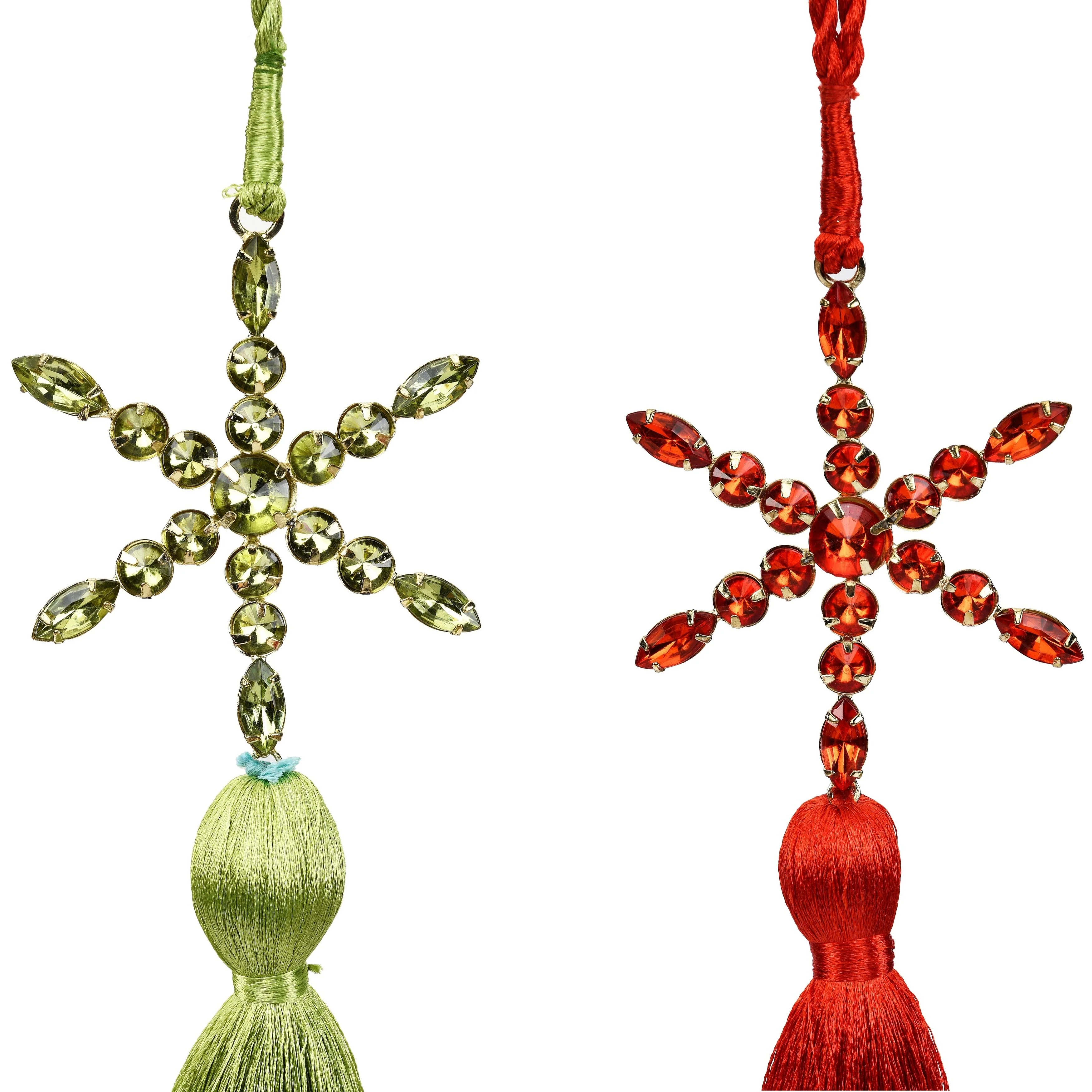 Set of 4. Includes four handmade different color faux crystal snowflake with tassel hanging Christmas ornaments.