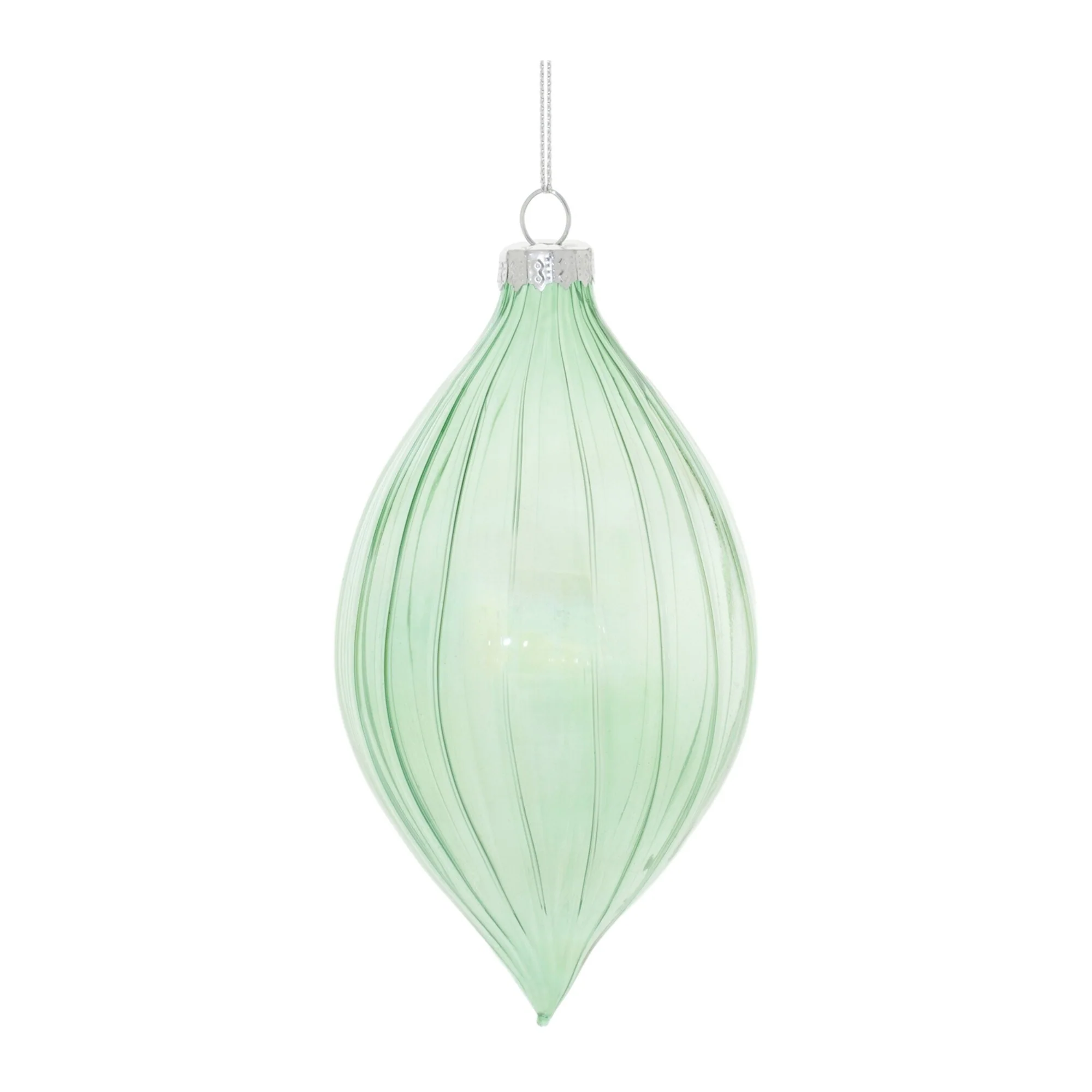 Bring a touch of elegance to your holiday décor with this set of iridescent ribbed glass ornaments. Featuring wintry green tones and a chic iridescent finish, these ornaments reflect light beautifully, creating a soft, sophisticated shimmer. The classic ball and onion shapes are enhanced by a ribbed glass texture that adds depth and visual interest. Each ornament is finished with a silver cap and delicate string hanger, making them perfect for trees, wreaths, or garlands. A timeless addition to your seasonal display.