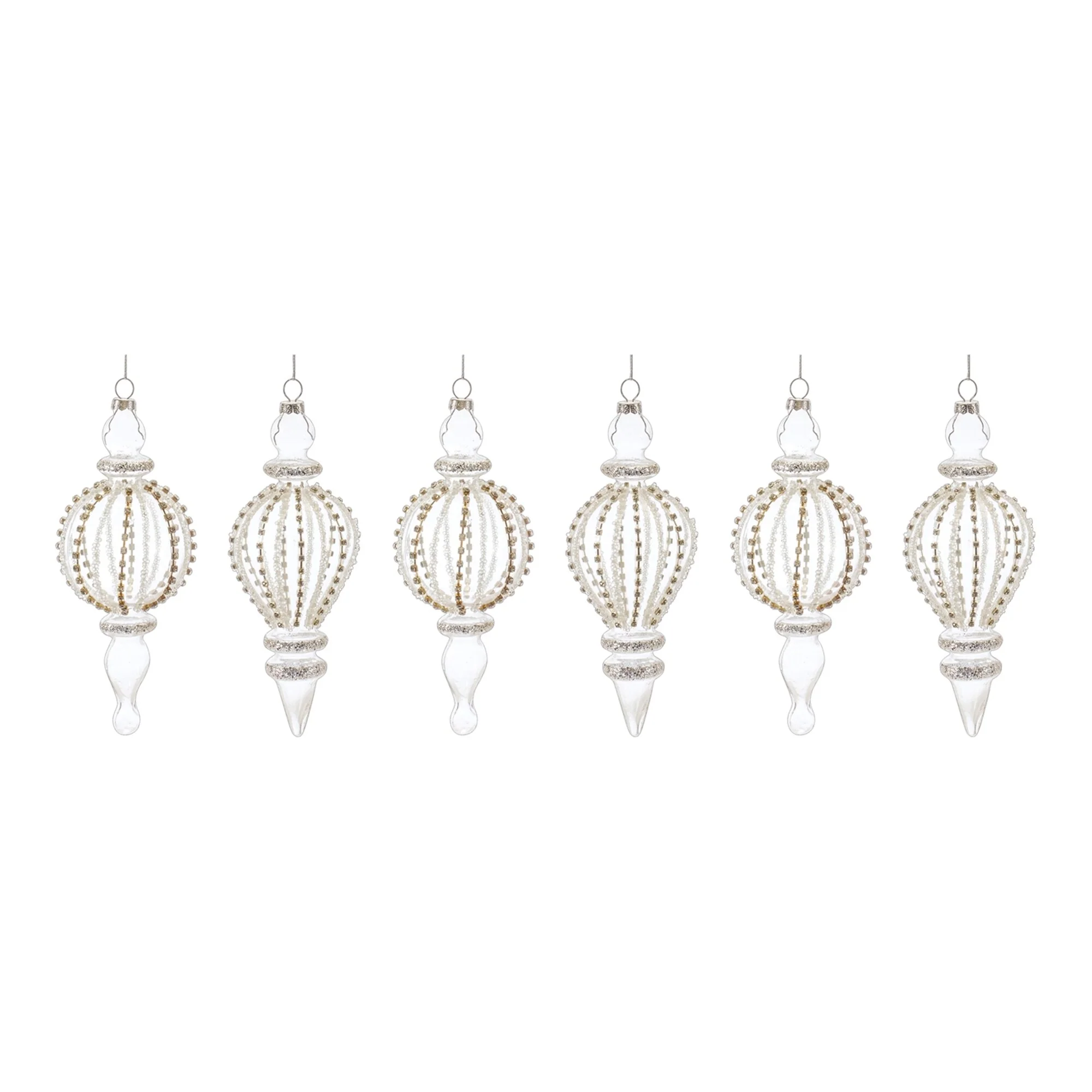 Elevate your Christmas tree and holiday decor with this exquisite set of jeweled glass finial drop ornaments. Their wintry tones and elegant finial design, adorned with sparkling jewels, create a captivating display. The delicate silver string hanger ensures their enduring beauty for seasons to come. Whether gracing your home or given as a cherished gift, these ornaments are guaranteed to bring smiles and add a touch of sophistication to your festive ambiance.